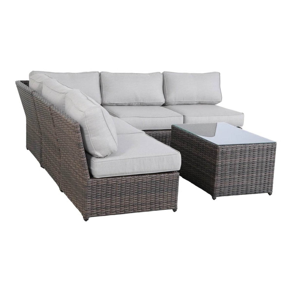 Upgrade your outdoor living space with this beautifully handcrafted wicker seating set designed for ultimate comfort and durability. Made from high-density polyethylene (HDPE) wicker woven over a rustproof aluminum frame, this brown outdoor furniture set blends classic style with modern resilience. The plush 5-inch thick cushions, wrapped in gray marine-grade olefin fabric, provide soft yet supportive seating for up to four people. Resistant to water, UV rays, and fading, these cushions ensure lasting comfort in any weather. Featuring a modular design with reversible layout and secure interlocking clips, this fully assembled set brings flexibility and convenience to your patio or garden. Complete with a sleek coffee table topped with tempered glass, it’s a perfect centerpiece for relaxing gatherings or quiet afternoons. Elevate your outdoor relaxation experience today with this all-in-one seating solution.