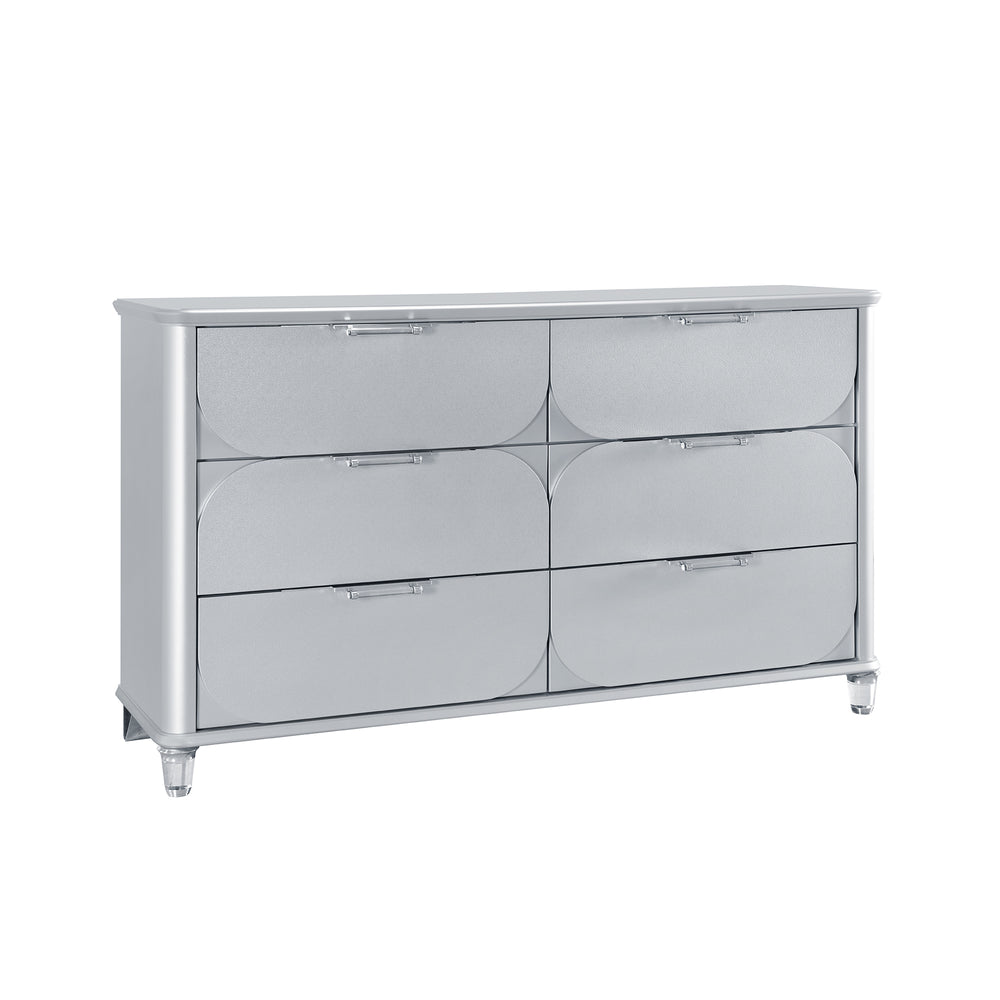 Transform your sleeping space with this contemporary 5-piece bedroom set, thoughtfully crafted with solid rubberwood and MDF for lasting durability. The silver finish complements any modern décor, while the upholstered headboard offers a plush, inviting touch. Featuring built-in LED lighting, this set adds both style and functionality, perfect for relaxing evenings. The panel-style bed is supported by sleek acrylic legs, enhancing its modern appeal. Spacious drawers provide ample storage, helping you keep your bedroom organized and clutter-free. Designed exclusively for queen-size beds with a required box spring, this set combines comfort, elegance, and practical storage solutions to create a serene retreat. Upgrade your bedroom ambiance and storage today.