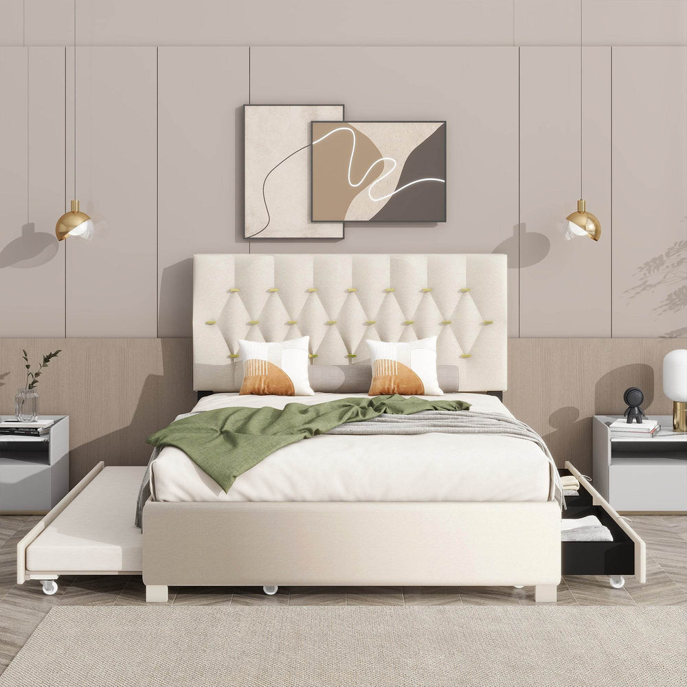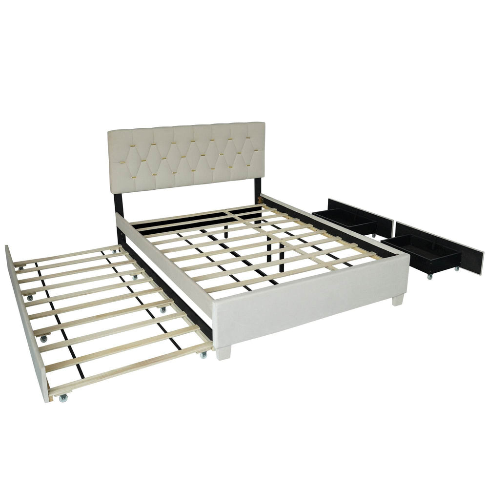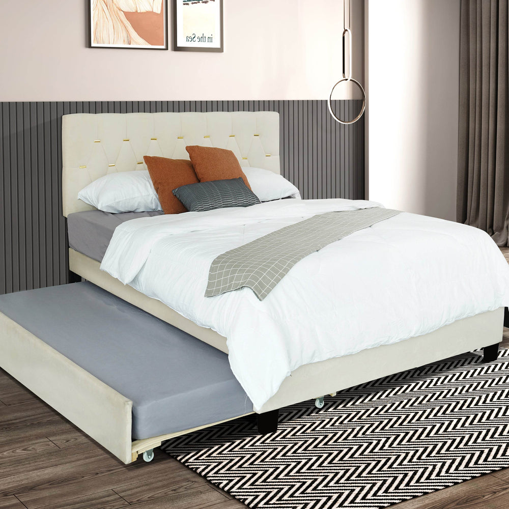 Beige Velvet Upholstered Queen Bed Frame With Trundle