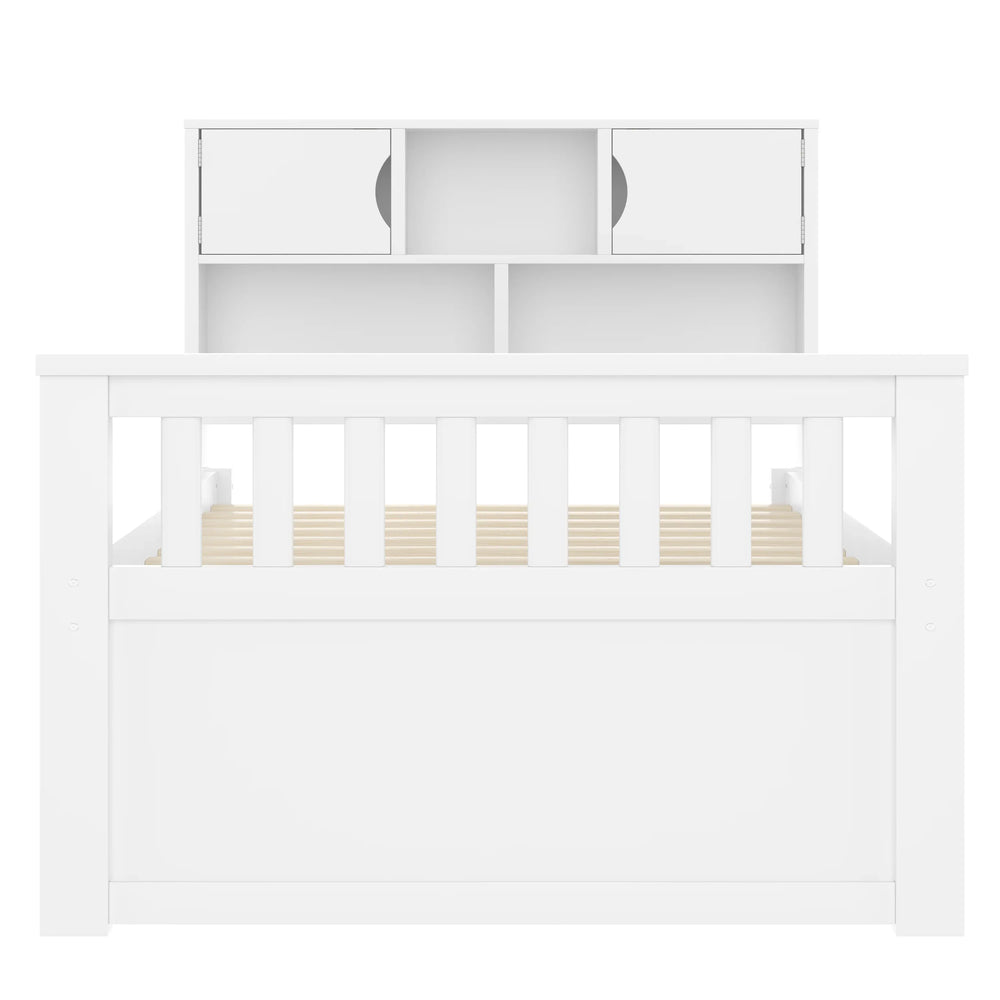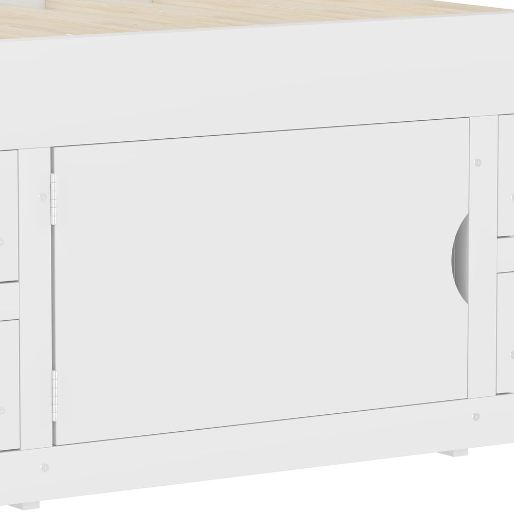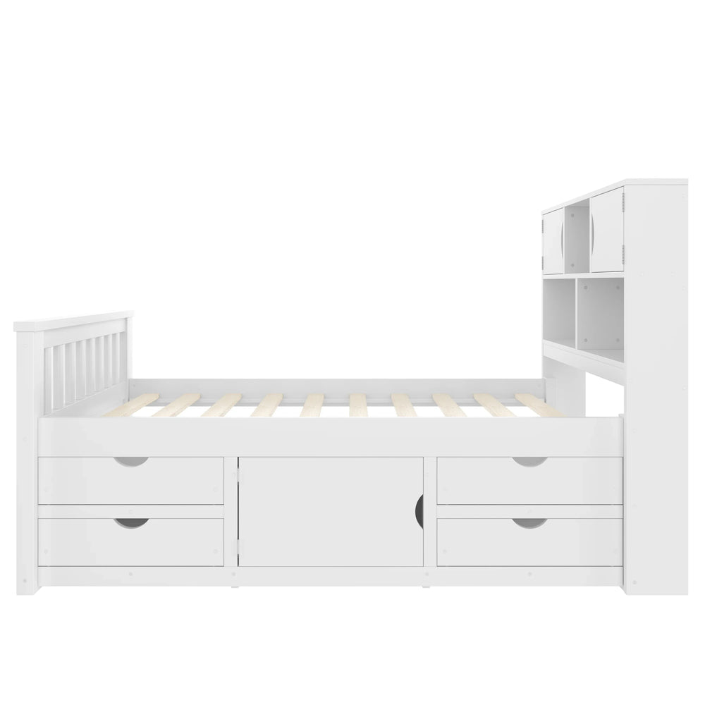 Discover the perfect blend of functionality and modern design with this twin size captain platform bed. Crafted from durable solid wood and MDF, its sturdy construction supports up to 300 pounds while eliminating the need for a box spring thanks to a reliable slat system. The bookcase headboard offers two open and two concealed storage spaces, ideal for displaying books and personal treasures. Four spacious under-bed drawers on smooth rails provide convenient, customizable storage to help keep your bedroom clutter-free. Finished in a clean white tone, this bed frame adds a fresh, stylish touch to any room. Scratch-resistant, stain-resistant, and waterproof surfaces ensure lasting beauty with easy care. Designed for easy assembly with clear instructions, this bed is a smart choice for small spaces and organized living. Elevate your bedroom storage and comfort today.
