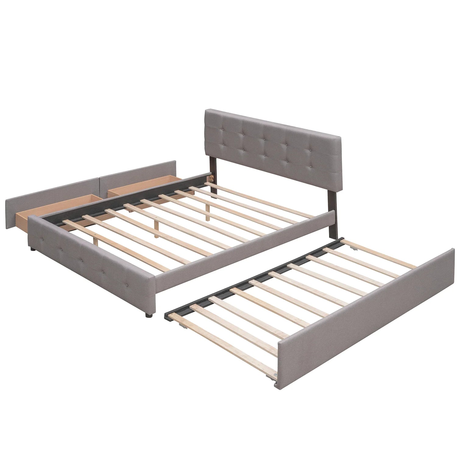Upgrade your bedroom with this elegant Upholstered Platform Bed, featuring a plush button-tufted linen fabric headboard filled with thick foam for enhanced comfort and modern charm. Crafted with a sturdy wood frame and durable plywood slats, it supports up to 600 pounds (272 kg) without the need for a box spring. Designed to maximize your space, this queen-sized bed includes two spacious drawers and a convenient twin XL trundle that easily slides out for extra sleeping room or storage. Its light gray upholstery complements various decor styles while providing a cozy backrest for reading or relaxing. With straightforward assembly and all necessary tools included, this bed offers a blend of style, comfort, and practicality to transform your sleep environment. Elevate your bedroom today and enjoy versatile storage and sleeping solutions that fit your lifestyle.