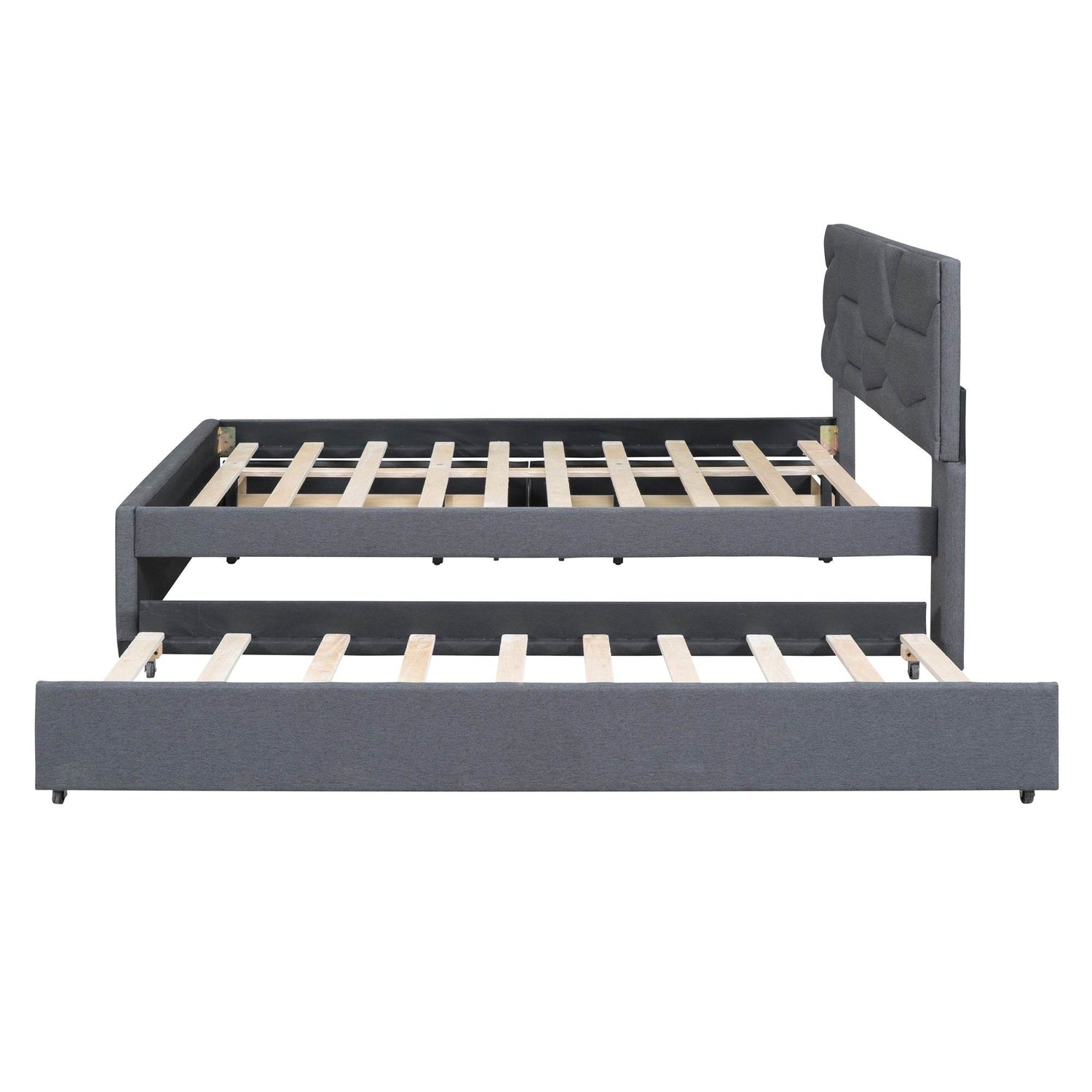 Upgrade your bedroom with this elegant full size upholstered platform bed featuring a modern brick pattern headboard in soft gray linen fabric. Its foam-filled upholstery and thick padding offer a cozy backrest perfect for reading or relaxing. Crafted from sturdy plywood and MDF, the solid construction supports up to 400 lbs, ensuring long-lasting stability without the need for a box spring. Designed for smart living, the bed includes a twin size trundle and two spacious drawers that effortlessly pull out, providing ample storage for bedding, clothes, or toys. With 10 wooden slats and 4 supportive legs, this platform bed delivers excellent mattress support and comfort. Easy to assemble with all tools included, it blends contemporary design with practicality. Elevate your bedroom’s comfort and organization today.