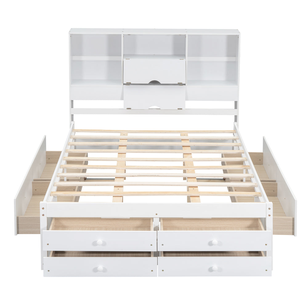 Experience smart design and durable comfort with this Queen Size Platform Bed, crafted from solid pine wood and MDF for lasting strength. Its clean white finish adds a fresh, modern touch to your bedroom, while the built-in storage headboard featuring multiple compartments keeps essentials organized and close at hand. With a total of 8 drawers—4 under the bed and 4 at the footboard—this bed frame offers ample storage for clothing, linens, and accessories, helping you maintain a clutter-free space. The sturdy wood slats eliminate the need for a box spring, providing reliable mattress support and extending mattress life. Designed for easy assembly and rated to hold up to 400 lbs, this space-saving bed frame combines style and function effortlessly. Elevate your bedroom storage and comfort today.