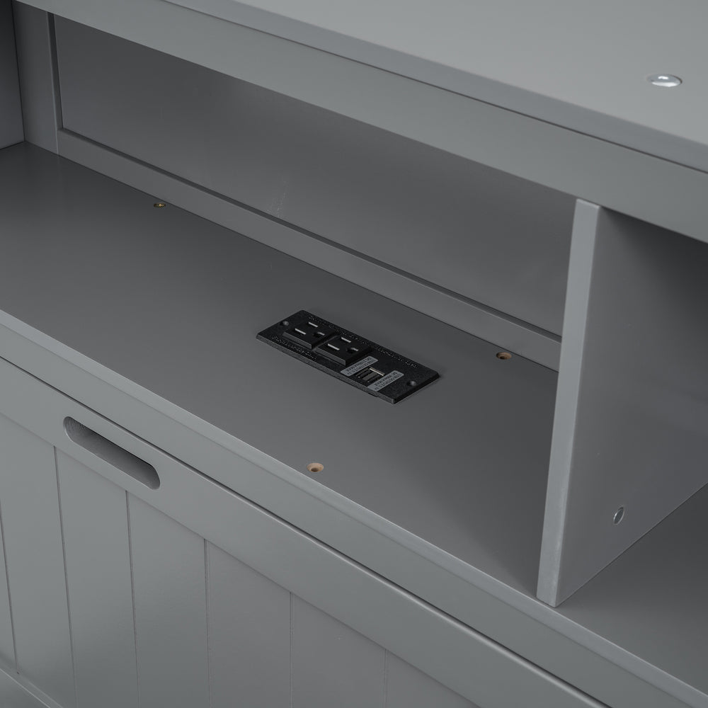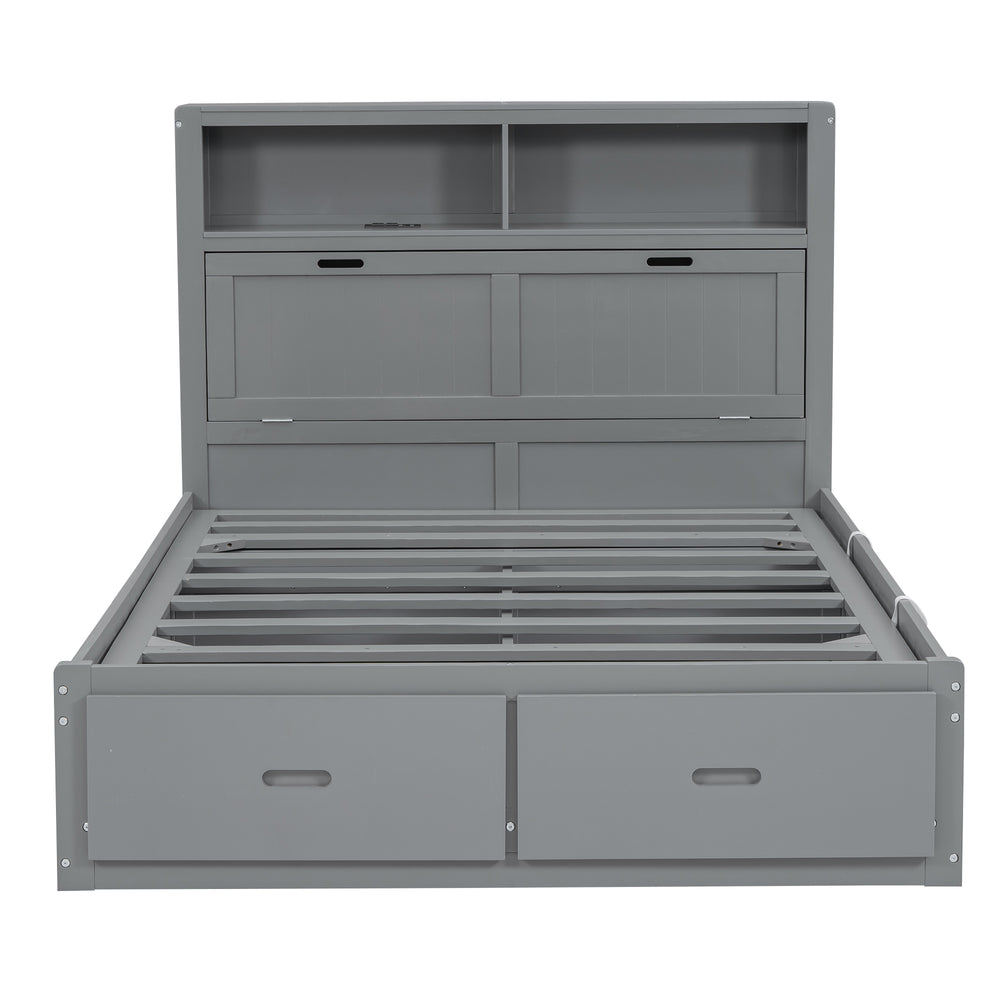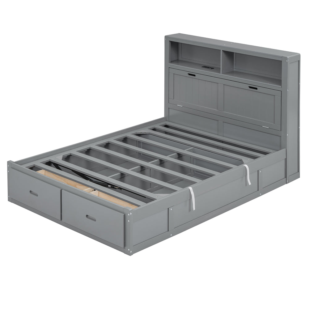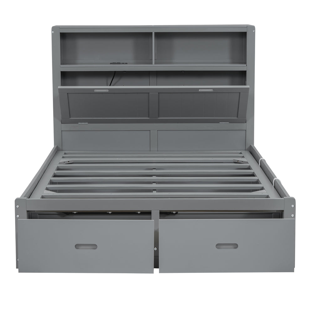 Upgrade your bedroom with this Full Size Hydraulic Platform Bed crafted from solid pine wood and MDF for durability and lasting support. Featuring a multifunctional headboard with LED lighting, shelves, and a hidden cabinet, it offers convenient storage and ambiance for your nighttime routine. The built-in charging station keeps your electronic devices powered within reach, perfect for working or relaxing in bed. Ample storage is available through two smooth-glide drawers and a spacious underneath compartment, keeping your bedroom organized and clutter-free. Its sturdy slatted foundation eliminates the need for a box spring, ensuring mattress longevity and stable support. With easy assembly and a sleek gray finish, this bed frame blends style, function, and comfort effortlessly. Elevate your sleep environment today with a bed that matches your lifestyle.