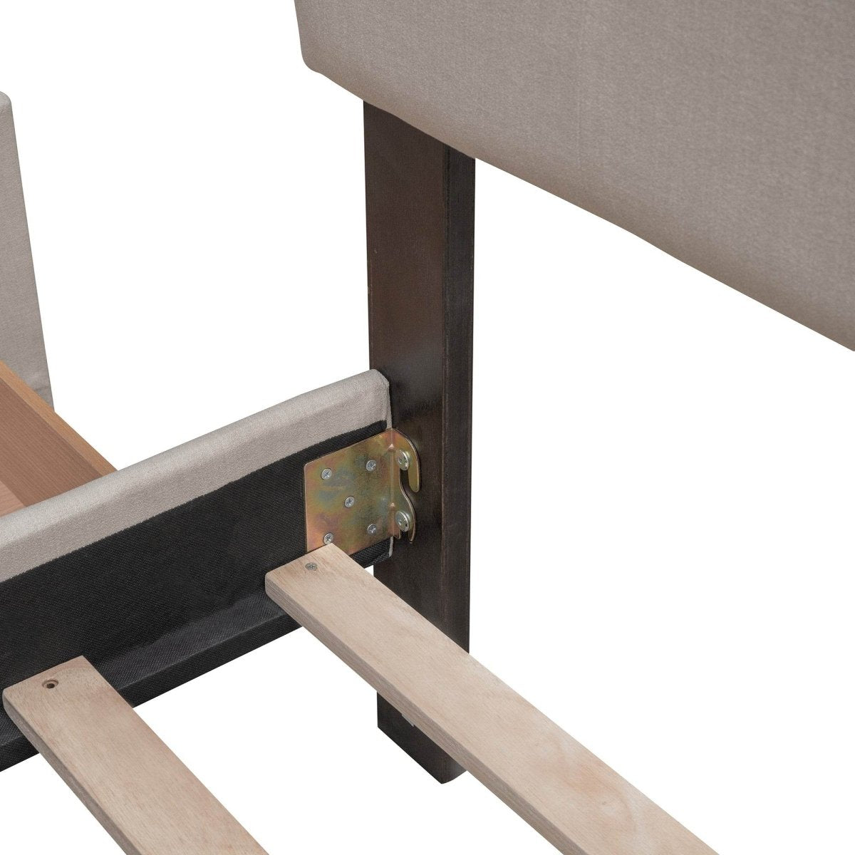 Upholstered platform bed features a foam-filled linen headboard with button-tufted design for comfort and style. Solid MDF and plywood frame supports up to 600 lbs, includes two storage drawers and a twin XL trundle for extra space and sleepover convenience.