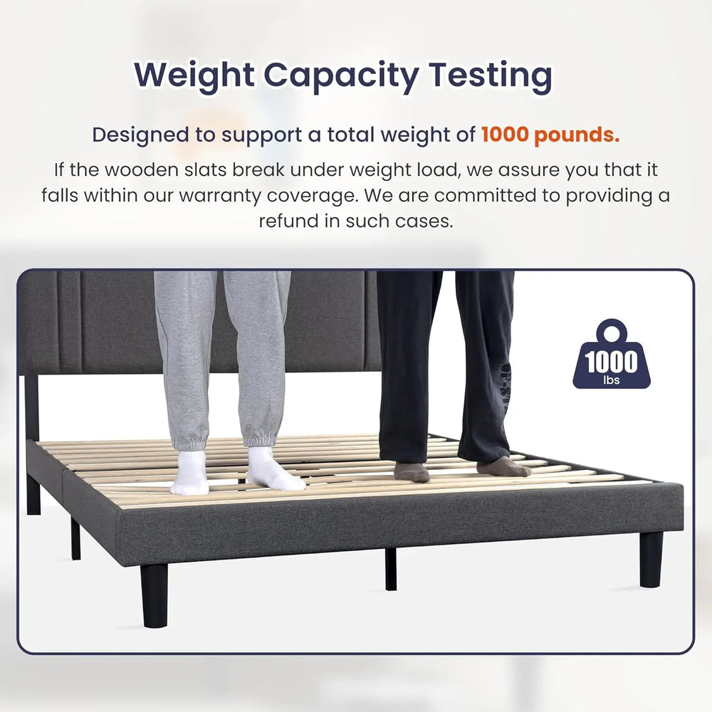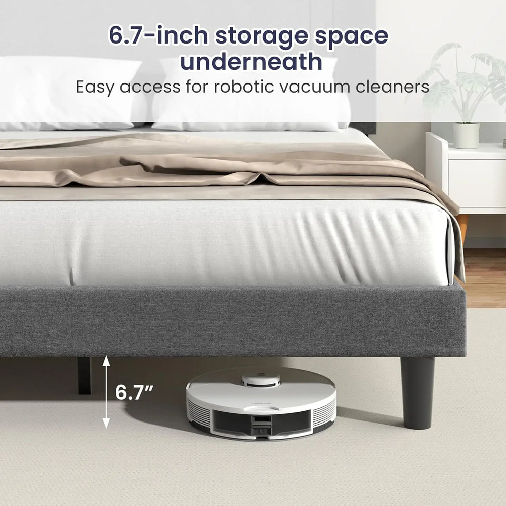 Upgrade your bedroom with this beautifully upholstered linen platform bed frame, designed for both durability and elegance. Featuring a fully adjustable headboard, it allows you to customize your comfort and rest posture effortlessly. Built with reinforced metal legs and sturdy wood slats, this frame supports up to 1000 lbs for reliable, noise-free sleep without the need for a box spring. Its spacious under-bed storage offers practical organization, perfect for keeping essentials within reach and your room clutter-free. Measuring approximately 62 x 81 x 45 inches (157.5 x 206 x 115 cm), this queen-size bed frame combines functionality and modern design to create a restful sanctuary. Elevate your sleep setup today with a frame that balances style, strength, and convenience.