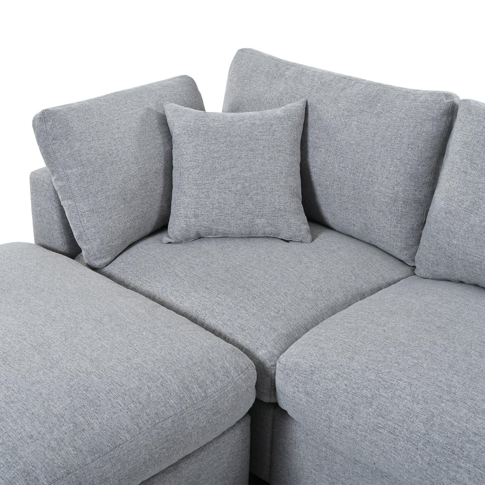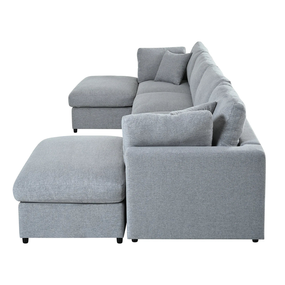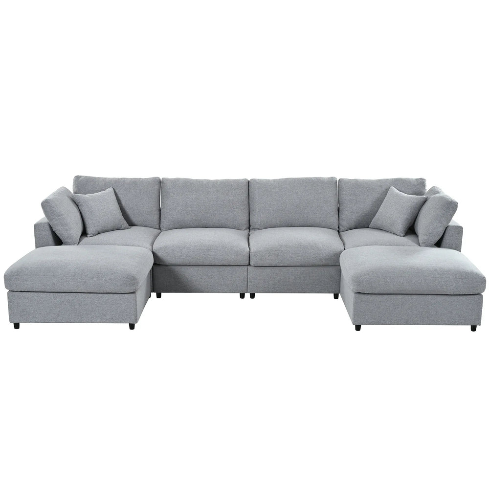 Gather family and friends in style with this expansive U-shaped sectional sofa designed to offer ultimate seating and versatility. Upholstered in soft, durable grey chenille fabric, it provides a plush yet resilient surface that resists wear and maintains its elegant look. The modular design features six customizable modules, allowing you to arrange it as a U-shape, L-shape, or convert it into a cozy bed to fit any space or occasion. Included are two movable ottomans that serve as footrests, extra seating, or chaise lounges for added relaxation options. Built on a sturdy solid wood frame with sinuous spring seats and high-density foam cushions wrapped in removable cotton-filled covers, this sofa delivers lasting comfort and support. Its sleek, modern lines make it a perfect centerpiece in living rooms, home theaters, or entertainment areas. Upgrade your space with this large, multi-functional sectional sofa to enjoy premium comfort and style every day.