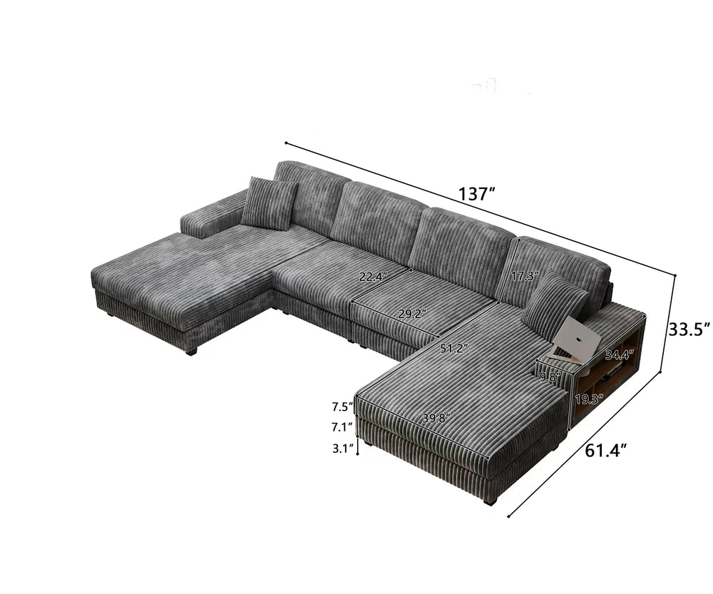 Elevate your living room with this modern, dark gray U-shaped sofa designed for ultimate comfort and style. Upholstered in textured corduroy fabric, it offers a rich visual appeal and a cozy touch. The spacious design accommodates multiple people, making it perfect for family gatherings or casual lounging. Built on a sturdy solid wood frame with high-density foam and pocketed coil springs, the cushions deliver exceptional support and durability. Wide, oversized armrests include convenient storage cabinets, helping you keep essentials close while saving space. Its modular sections detach easily for quick assembly and effortless movement through tight spaces. Add a touch of modern minimalism to your home while enjoying versatile functionality and plush comfort. Upgrade your living space today.