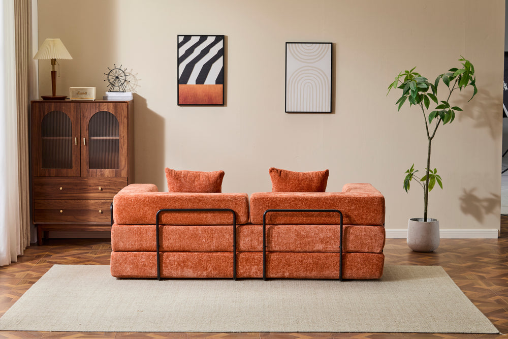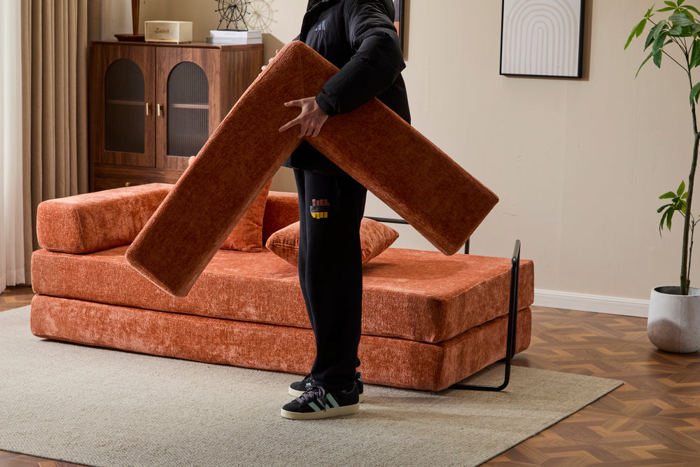 Revolutionize your living space with this convertible floor couch, crafted for both lounging and sleeping comfort. Upholstered in soft, breathable orange chenille fabric, it offers luxurious texture and durability that stands up to daily use. The memory foam padding provides plush support, adapting to your body whether you're relaxing, watching TV, or hosting overnight guests. Easily transform it from a stylish 3-seat sofa into a full sleeper bed by folding the armrests or backrest, making it ideal for small apartments, bedrooms, or game rooms. Compact yet spacious at 76.8 inches long and 37.4 inches wide, it fits perfectly in modern living areas. No assembly is needed, and with its foldable design, this futon sofa bed saves valuable space without sacrificing comfort. Elevate your relaxation and versatility today.