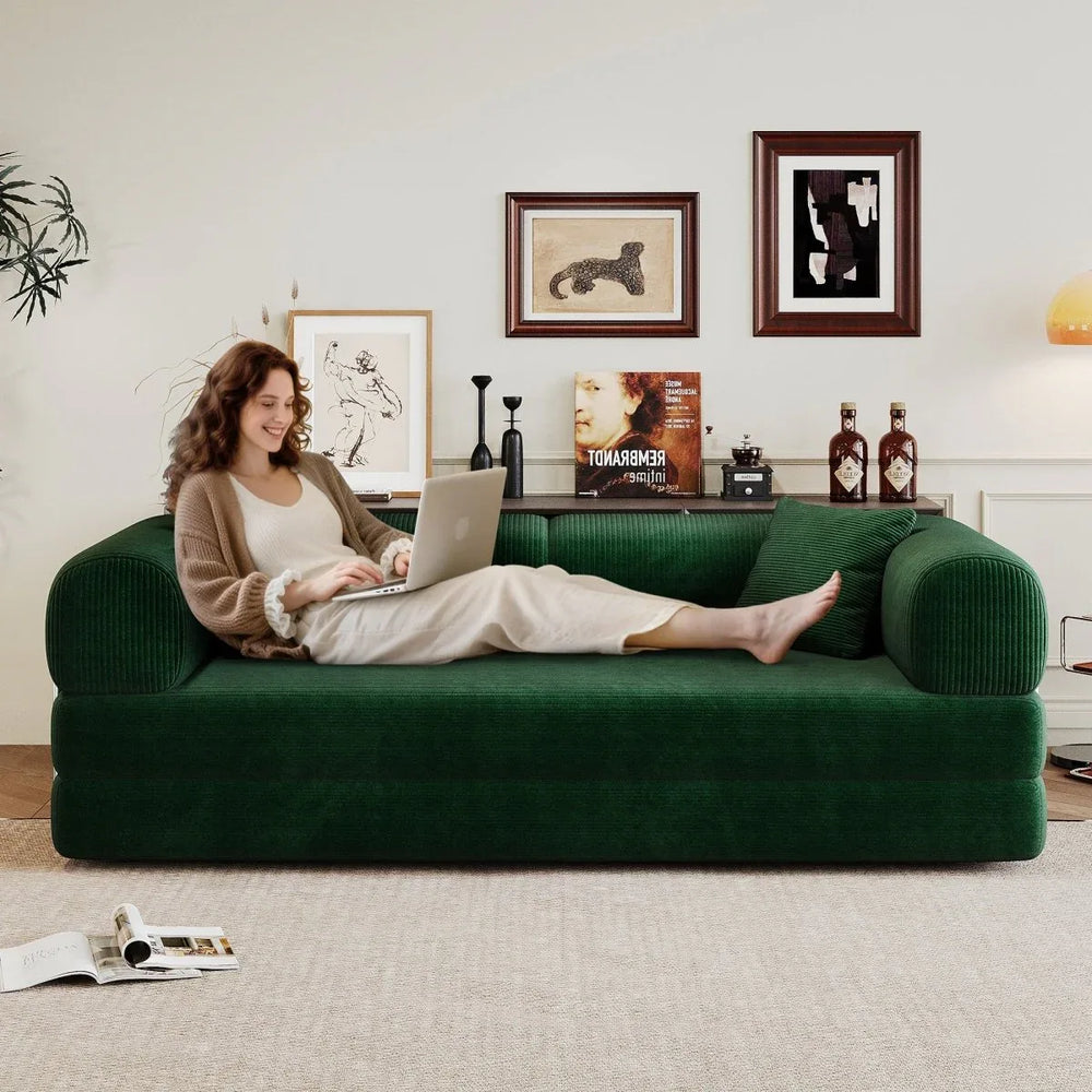 Transform your living space effortlessly with this 78.8-inch compression sofa, designed to combine style, comfort, and functionality. Upholstered in plush green corduroy fabric, it offers a cozy seating experience with foam filling that supports relaxation throughout the day. Easily convert it into a floor sofa bed with supportive pillow backrests and armrests, perfect for lounging or a restful nap. Its boneless modular design allows for flexible arrangements, adapting to living rooms, bedrooms, or apartments. Assembly is hassle-free—just unpack and enjoy instant comfort. Elevate your home comfort today with this multifunctional sectional sofa that blends modern design with everyday convenience.