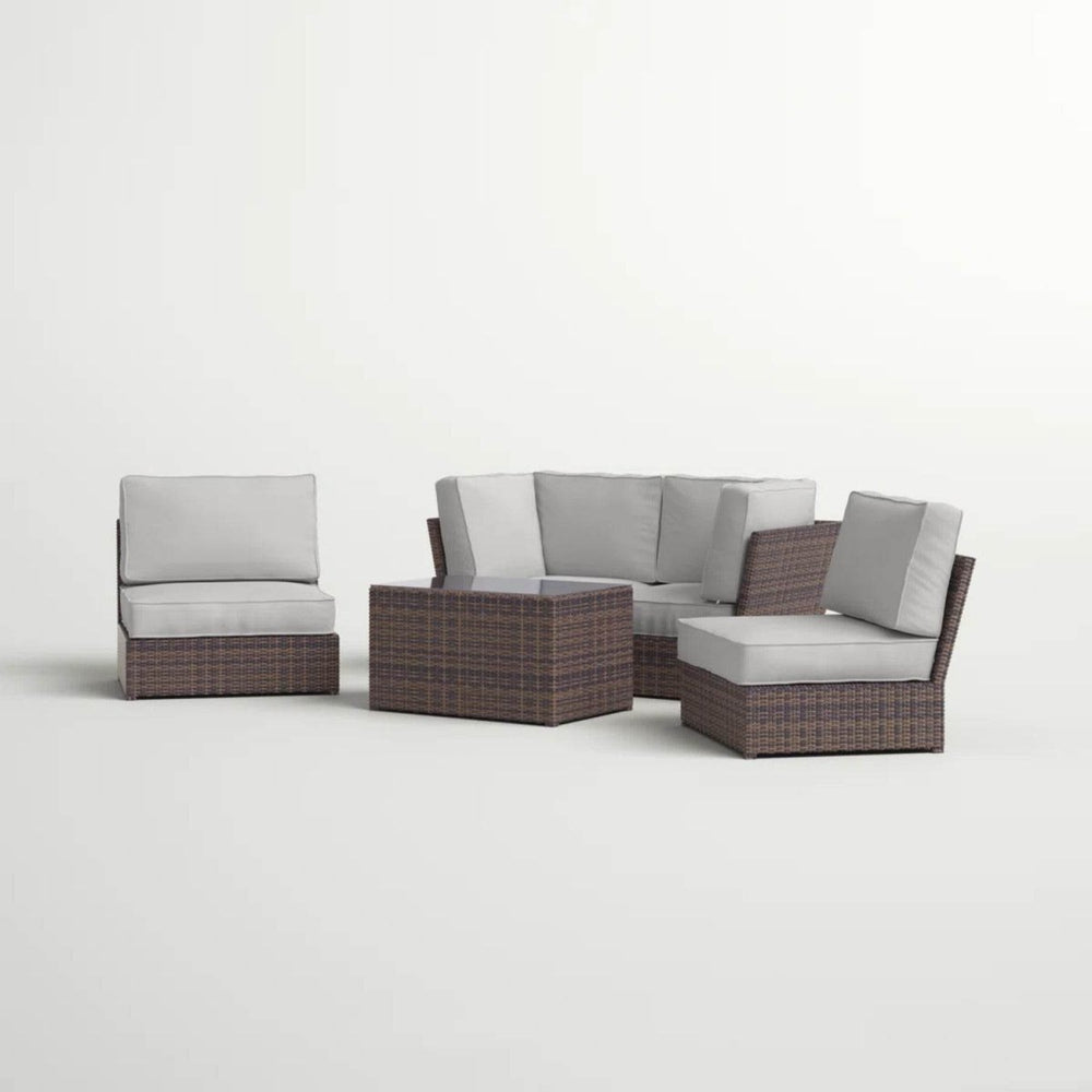 Fully assembled 5-piece outdoor wicker sofa set features weather-resistant resin wicker and aluminum frame with customizable modular layout. Includes water- and UV-resistant cushions with zippered, machine-washable covers for plush, easy-care comfort, plus a tempered glass-top coffee table.