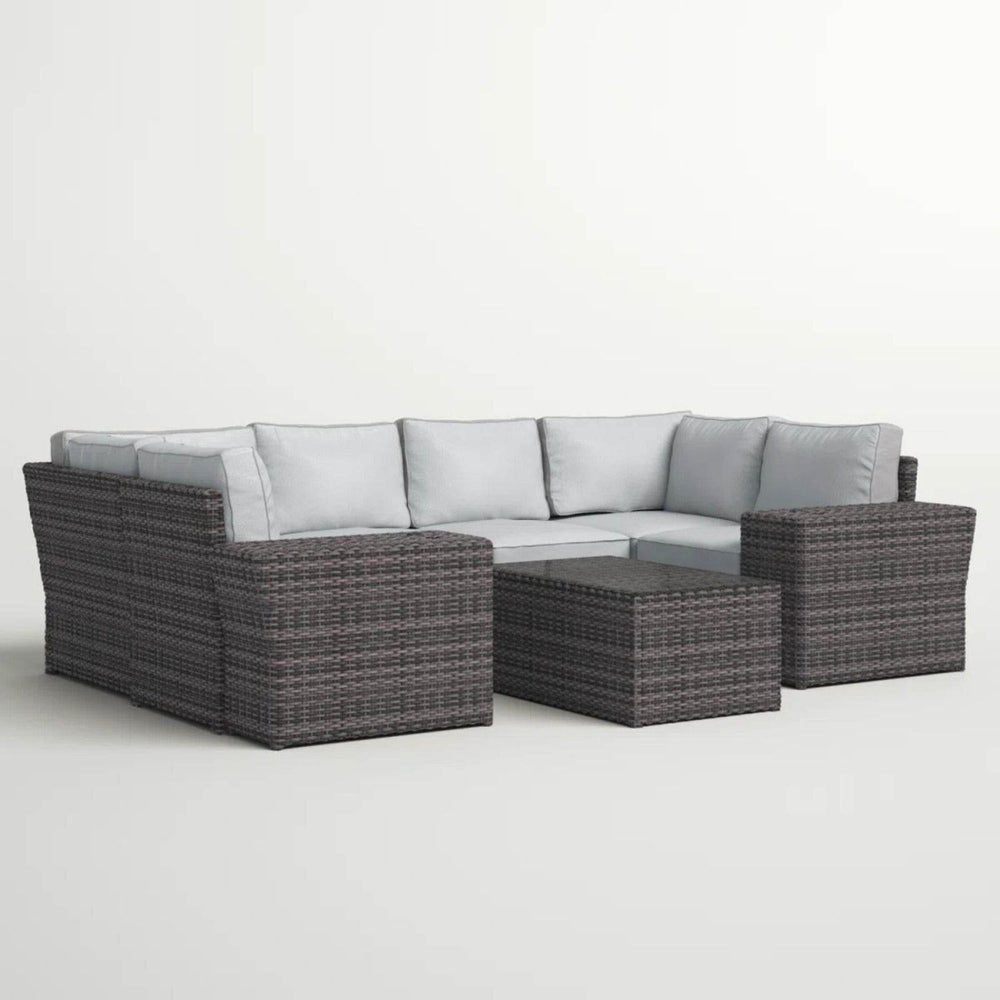 4-person outdoor wicker sofa set features six deep seats, two end tables with cup holders, and a glass-top coffee table, all with weather-resistant aluminum frames and water-resistant, machine-washable cushions for durable, comfortable year-round outdoor seating.