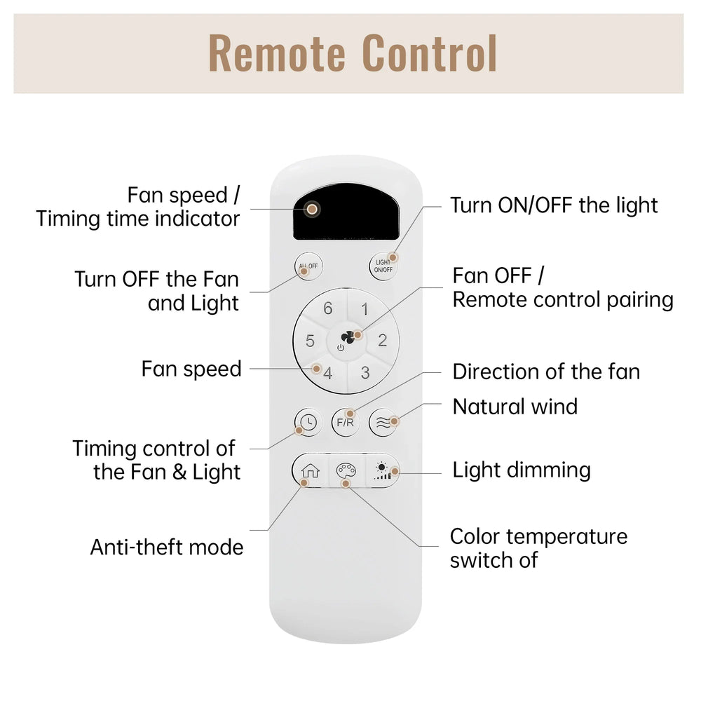 46 inch ceiling fan with off white ABS blades features a reversible DC motor for energy-efficient, quiet airflow and year-round comfort. Includes remote control with 6 speeds, timer, and 3-color LED lighting, ideal for bedrooms, living rooms, and covered outdoor spaces.