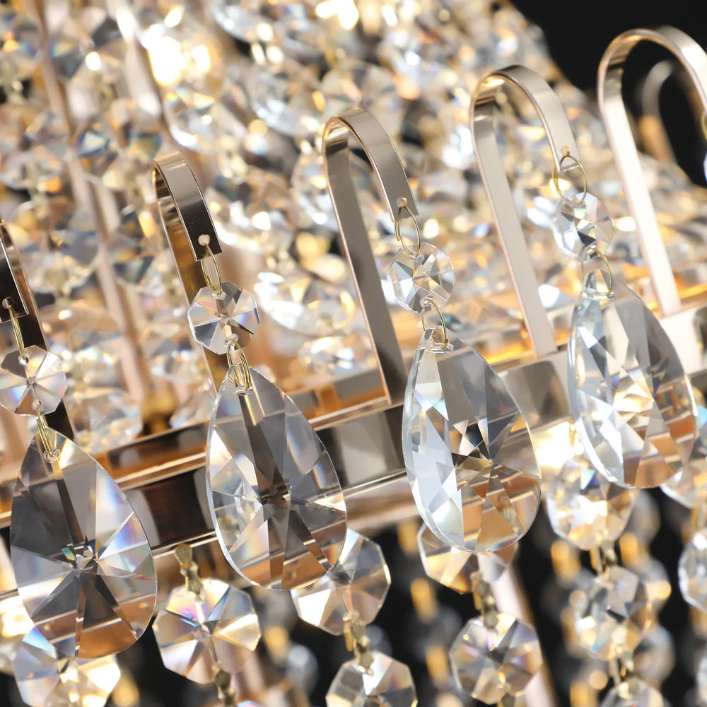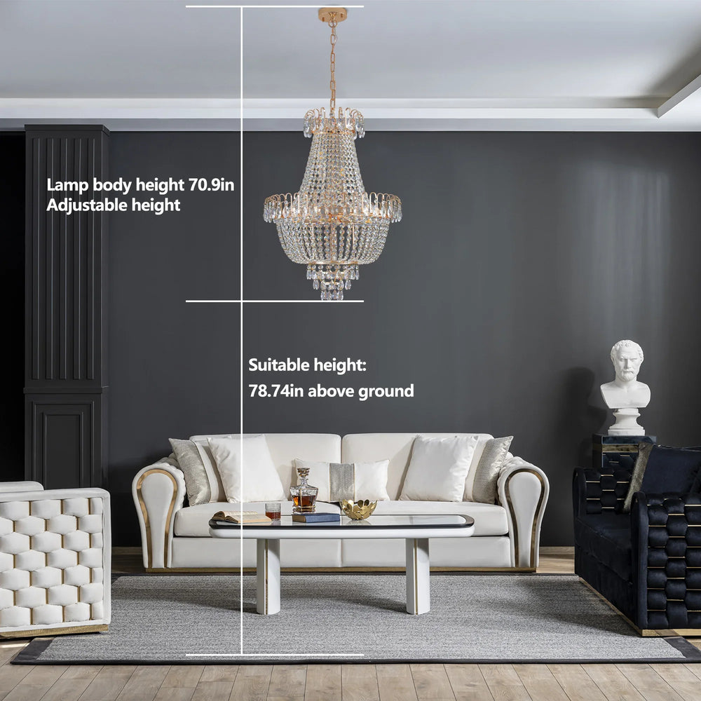 Gold Crystal Chandelier features top-quality iron and K9 crystal materials with a sophisticated design that sparkles from every angle. Ideal for indoor spaces like living rooms, dining rooms, and foyers, it requires 10 E12 bulbs (not included) for elegant lighting.