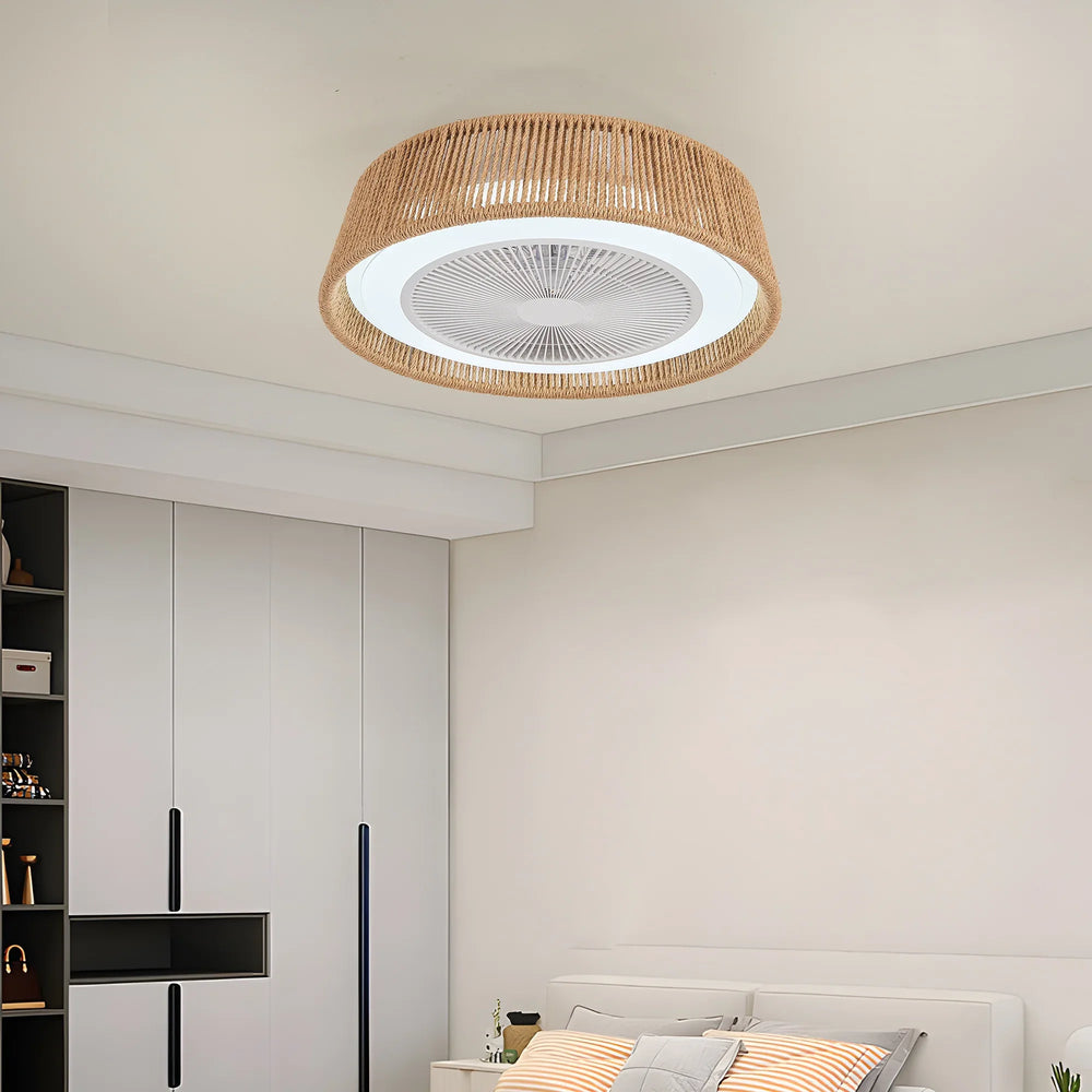 This modern rustic ceiling fan light features a unique hemp rope woven design with adjustable LED RGB mood lighting and a silent 6-speed reversible DC motor fan, offering quiet air circulation and customizable ambiance for bedrooms, living rooms, or dining spaces.