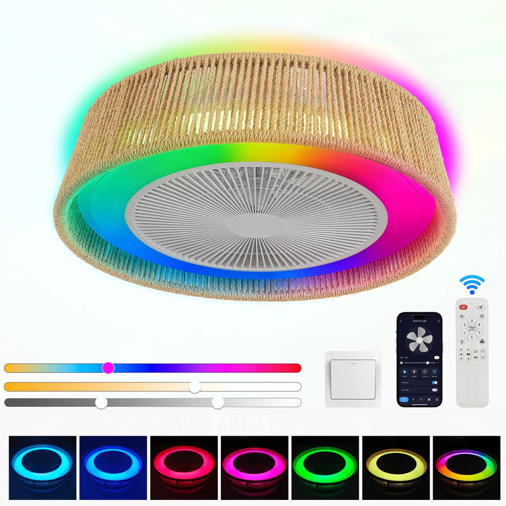 Bring warm, natural style and advanced functionality to your living space with this 21-inch modern rustic ceiling fan light. Featuring a unique hemp rope woven lampshade, it adds a cozy, handcrafted touch that complements modern and pastoral décor alike. The integrated silent fan delivers powerful, quiet air circulation to maintain fresh indoor air without disruptive noise. Enjoy customizable LED RGB mood lighting with adjustable brightness and color temperature settings, perfect for setting the ideal ambiance for any occasion—from relaxing evenings to lively gatherings. Controlled easily via remote or app, this semi-flush mount ceiling fan light is designed for convenient installation and lasting performance. Elevate your bedroom, living room, or dining area with this stylish, multifunctional lighting and cooling solution today.