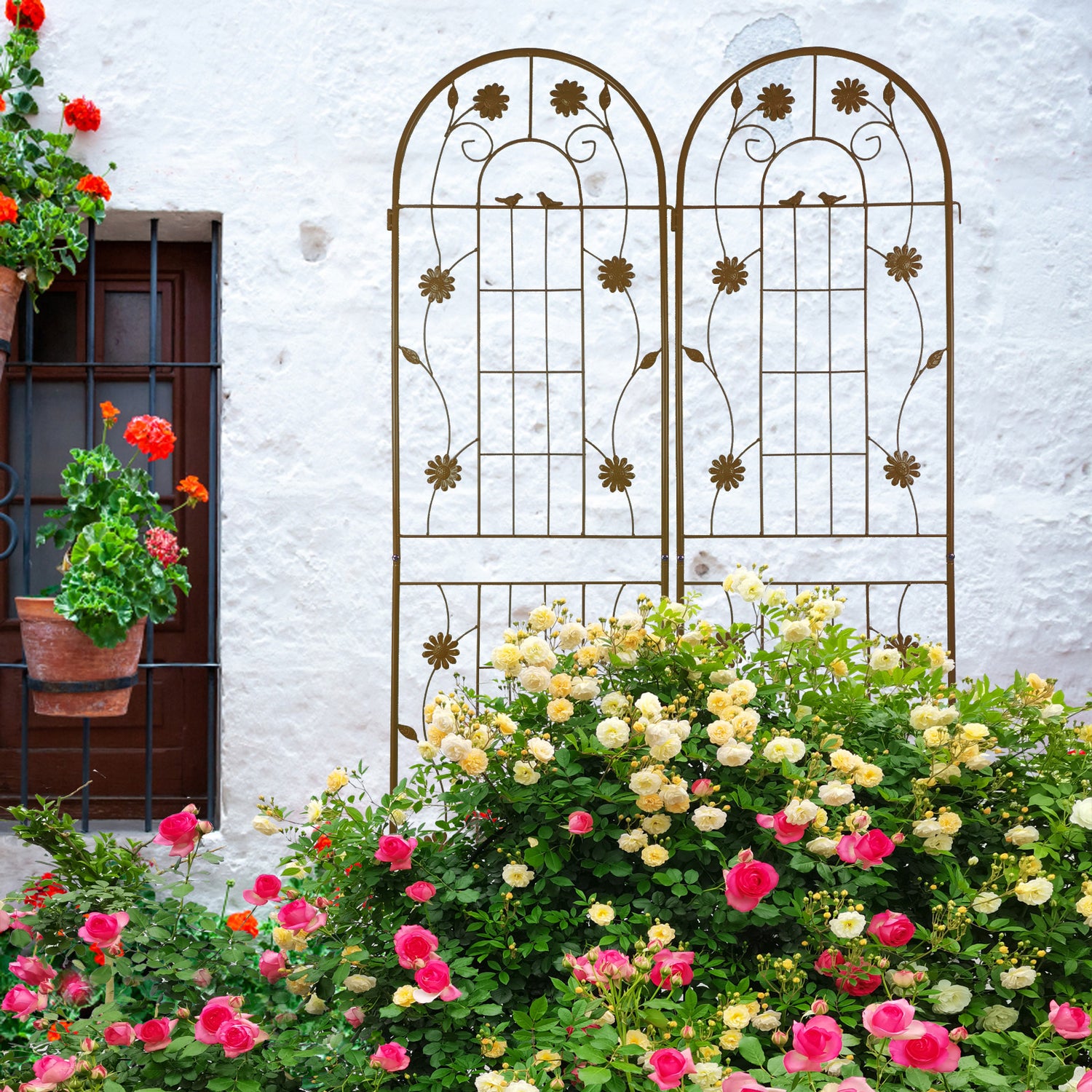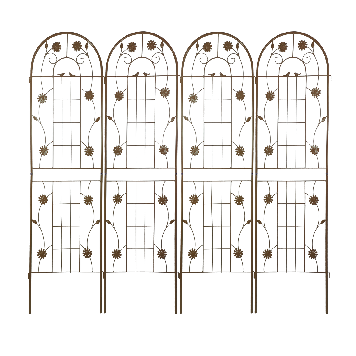 Durable brown iron garden trellis features a rustproof powder-coated finish and easy assembly with pre-drilled holes. Ideal for supporting climbing plants outdoors, this French country-style trellis enhances garden decor and can be combined to create screens or corners.
