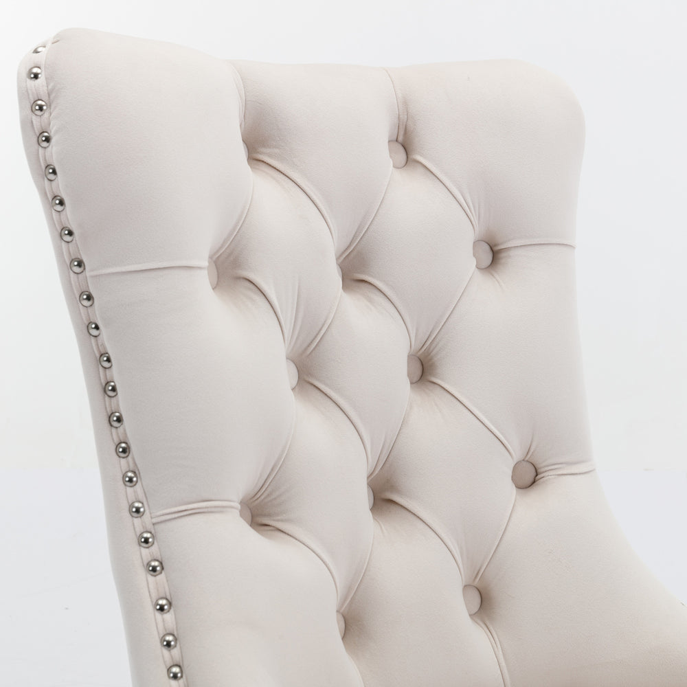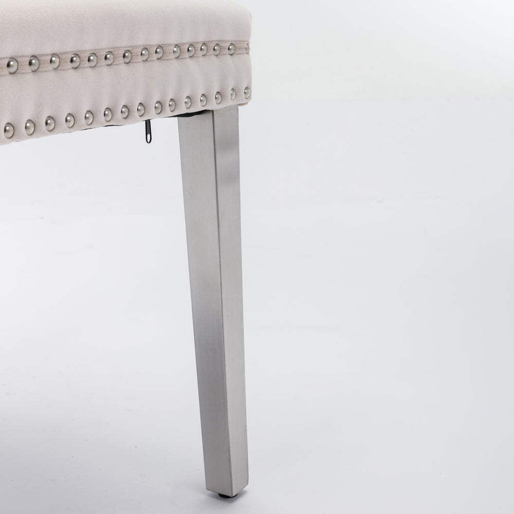 Elevate your dining space with the Nikki Collection’s modern and sophisticated velvet chairs. Featuring plush foam cushioning wrapped in soft beige velvet upholstery, these chairs deliver luxurious comfort and style for long-lasting use. The solid wood frame ensures sturdy support, while sleek chrome-plated stainless steel legs add a contemporary flair that complements any décor. Nailhead trim detailing accentuates the elegant tufted backrest, creating a refined look perfect for upscale dining rooms or stylish living areas. Measuring 24.6 inches long by 19.7 inches wide and standing 37.5 inches tall, these chairs are designed for comfortable seating without occupying excess space. Whether hosting dinner parties or enjoying everyday meals, these chairs combine durability, comfort, and modern design. Upgrade your home with this stunning set of two and savor every meal in style. Elevate your dining atmosphere today.