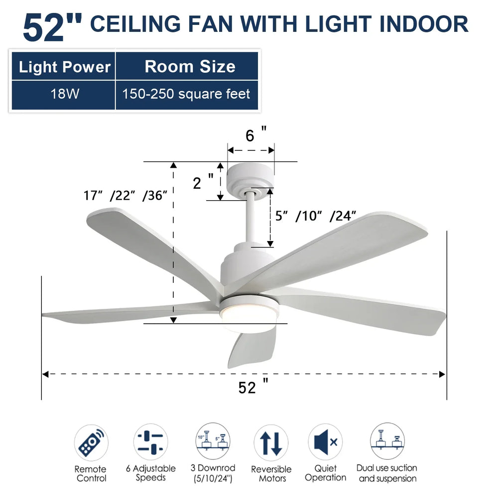 52-inch modern ceiling fan features 5 solid wood blades, a reversible DC motor with 6-speed remote control, and dimmable 3-color LED lighting. Energy-efficient and quiet, it suits medium to large indoor spaces for year-round comfort and smart app control.