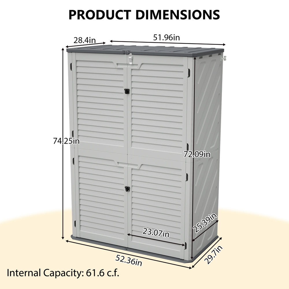 Keep your garden tools and outdoor equipment neatly stored and protected year-round with this spacious resin storage cabinet. Crafted from durable, rust proof plastic, it stands up to weather and UV exposure without fading or cracking. The roomy design, measuring approximately 52 inches long, 30 inches wide, and 74 inches high, offers ample space for bulky items, helping you declutter garages, patios, or garden sheds effortlessly. Its clean white finish blends seamlessly with any outdoor or indoor area, while the closed doors keep contents safe and out of sight. Easy to assemble and maintain, this weatherproof storage solution enhances both the organization and longevity of your gardening gear. Elevate your outdoor storage today with a cabinet built for convenience and durability.