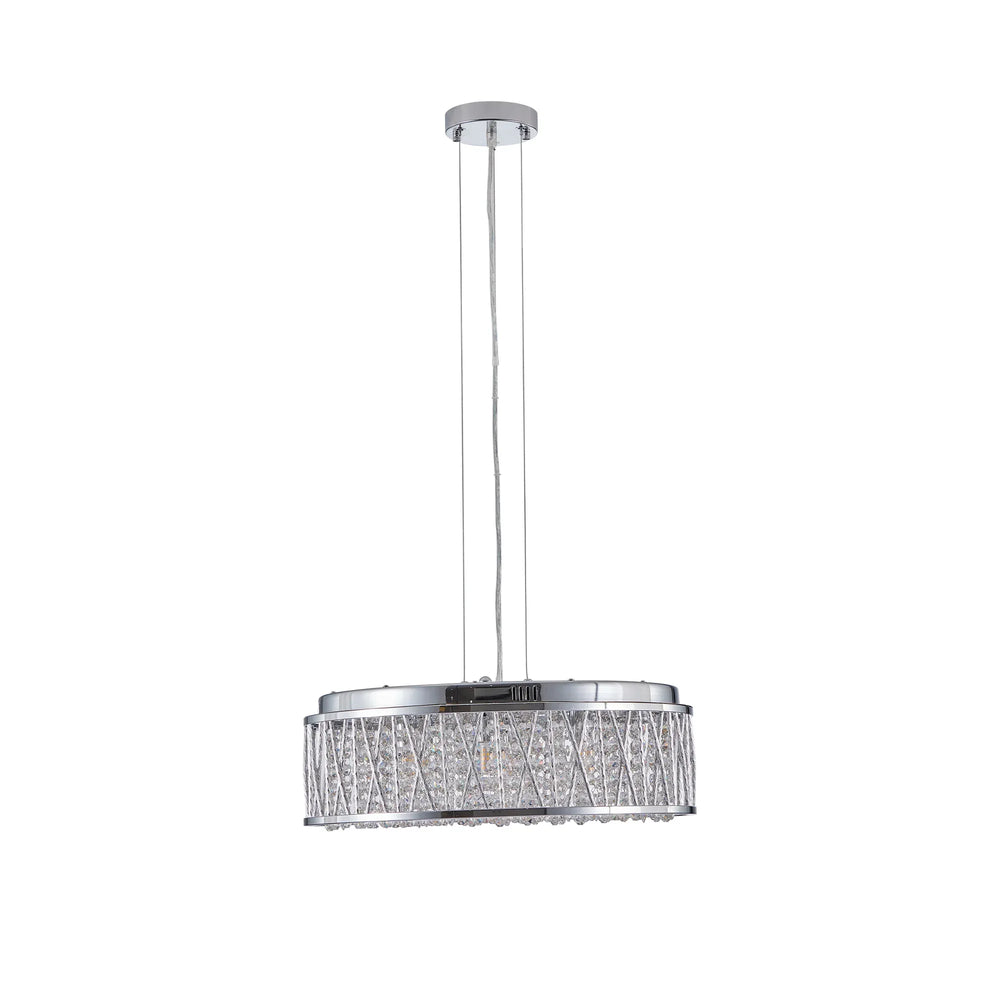 Crystal chandelier ceiling light features a modern round design with chrome-finished iron and clear crystal accents, ideal for illuminating entryways, bedrooms, or bathrooms up to 150 sq ft. Adjustable height and easy installation enhance home décor and ambiance.
