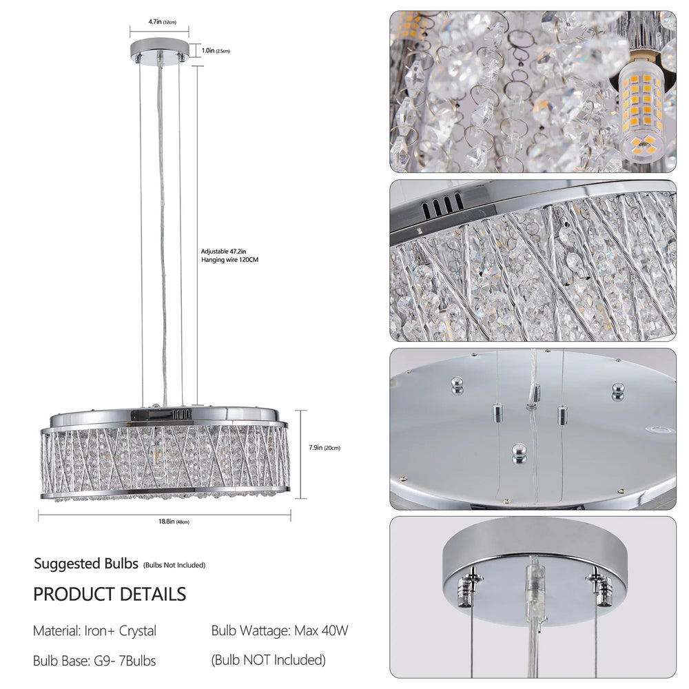 Enhance any room with this stunning 19-inch Modern Crystal Chandelier, expertly crafted from durable iron and aluminum with brilliant crystal accents. Its sleek round design complements a variety of decor styles, making it ideal for kitchens, dining rooms, bedrooms, halls, and more. The flush mount fixture creates a luxurious glow that brightens spaces of 100 to 150 square feet, while the adjustable hanging height offers flexible installation for perfect placement. Designed to accommodate seven G9 base bulbs (not included), this chandelier delivers radiant, elegant lighting to transform your home atmosphere. Easy to install with all hardware and instructions included, this silver and clear crystal chandelier effortlessly combines style and functionality. Elevate your lighting décor today.