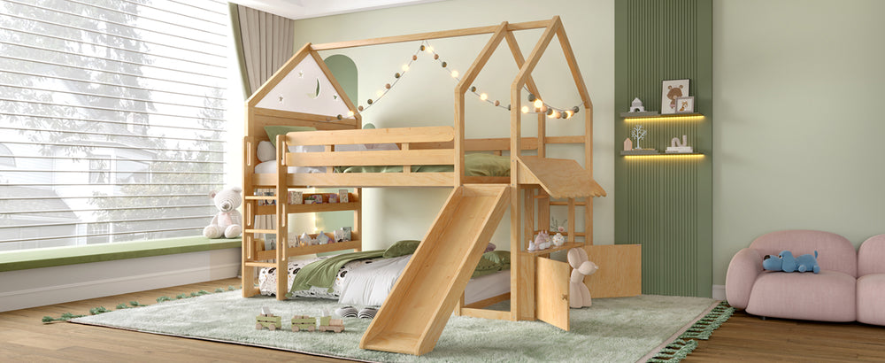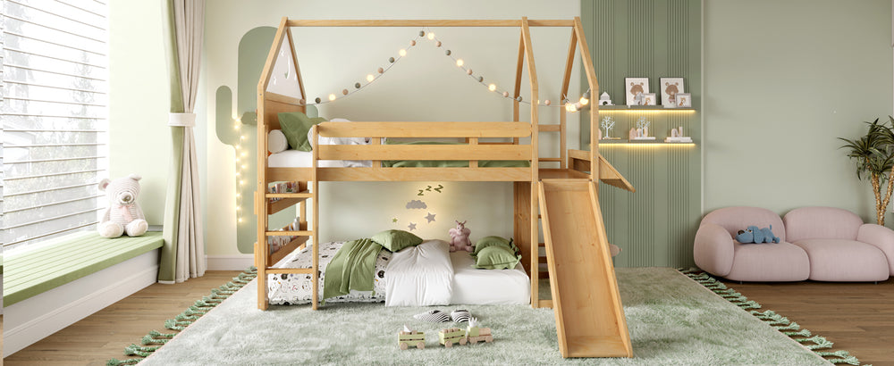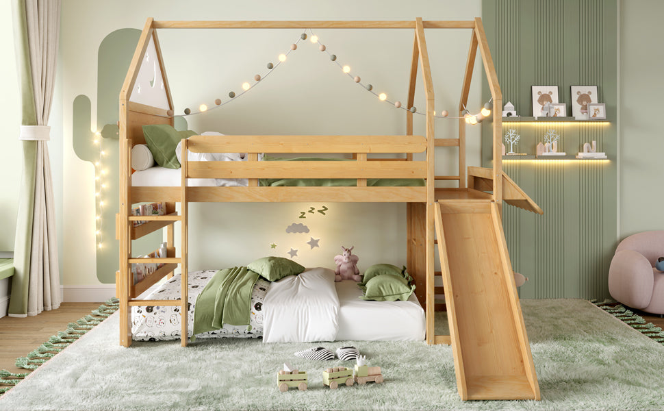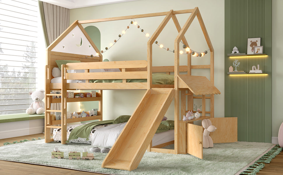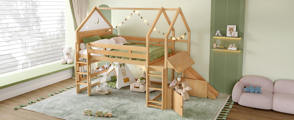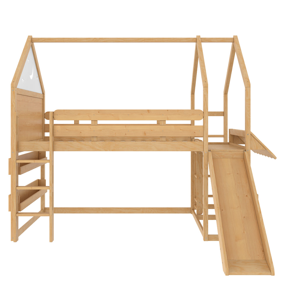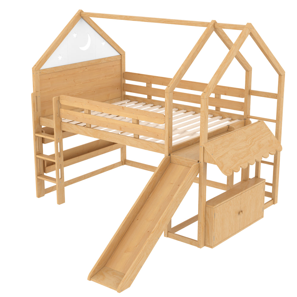 Transform your child’s bedroom into a magical fairytale retreat with this Full Size Loft Bed featuring a charming star and moon house design. Crafted from sturdy pine, MDF, and plywood, this natural-finished bed combines playful aesthetics with practical functionality. The loft’s upper level offers a comfy sleeping space, while the spacious lower area adapts to your child’s needs—a cozy play zone, study nook, or reading corner with built-in bookshelves. Multiple access points including front stairs, a side ladder with reversible installation, and a fun slide provide safe, versatile ways for kids to climb up and enjoy hours of active play. Its robust construction supports up to 550 lbs on the bed and 180 lbs on the slide, ensuring dependable stability. With full assembly and detailed instructions included, it’s easy to bring this enchanting piece home. Elevate your child’s room with imaginative design and smart space-saving solutions today.