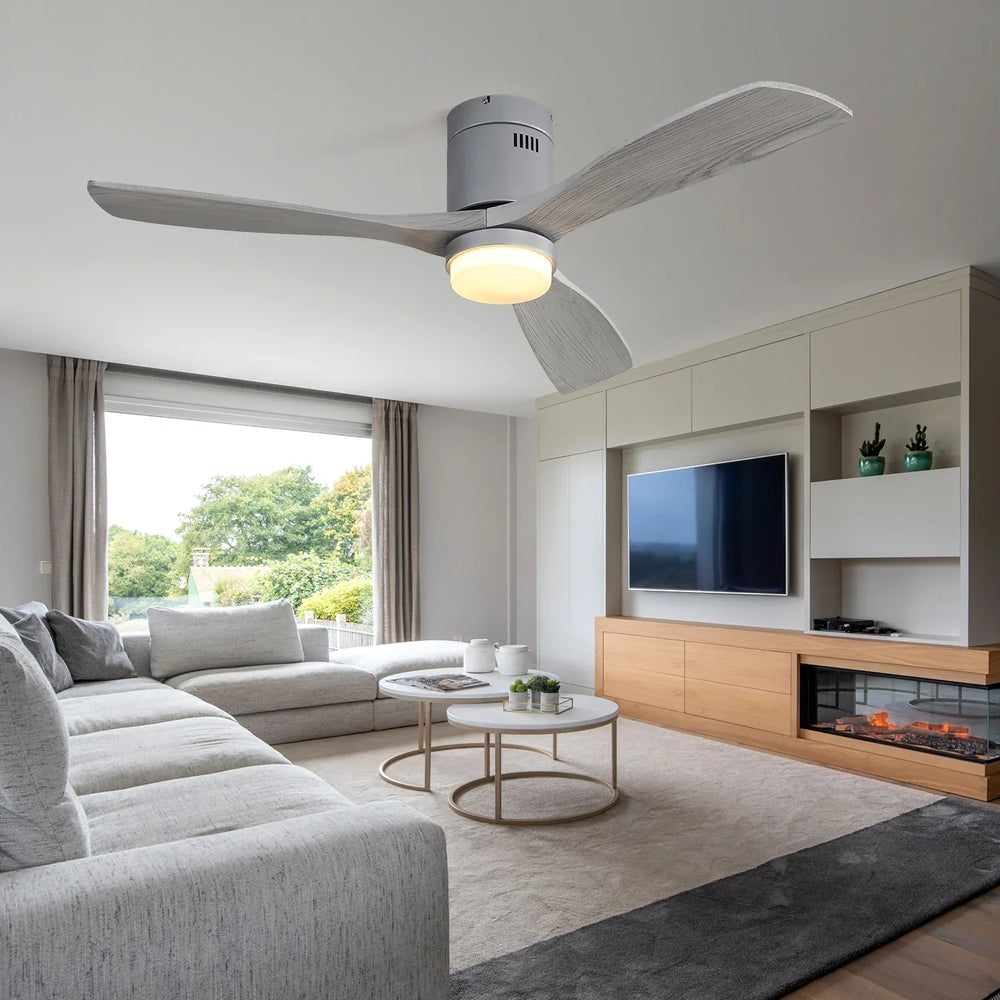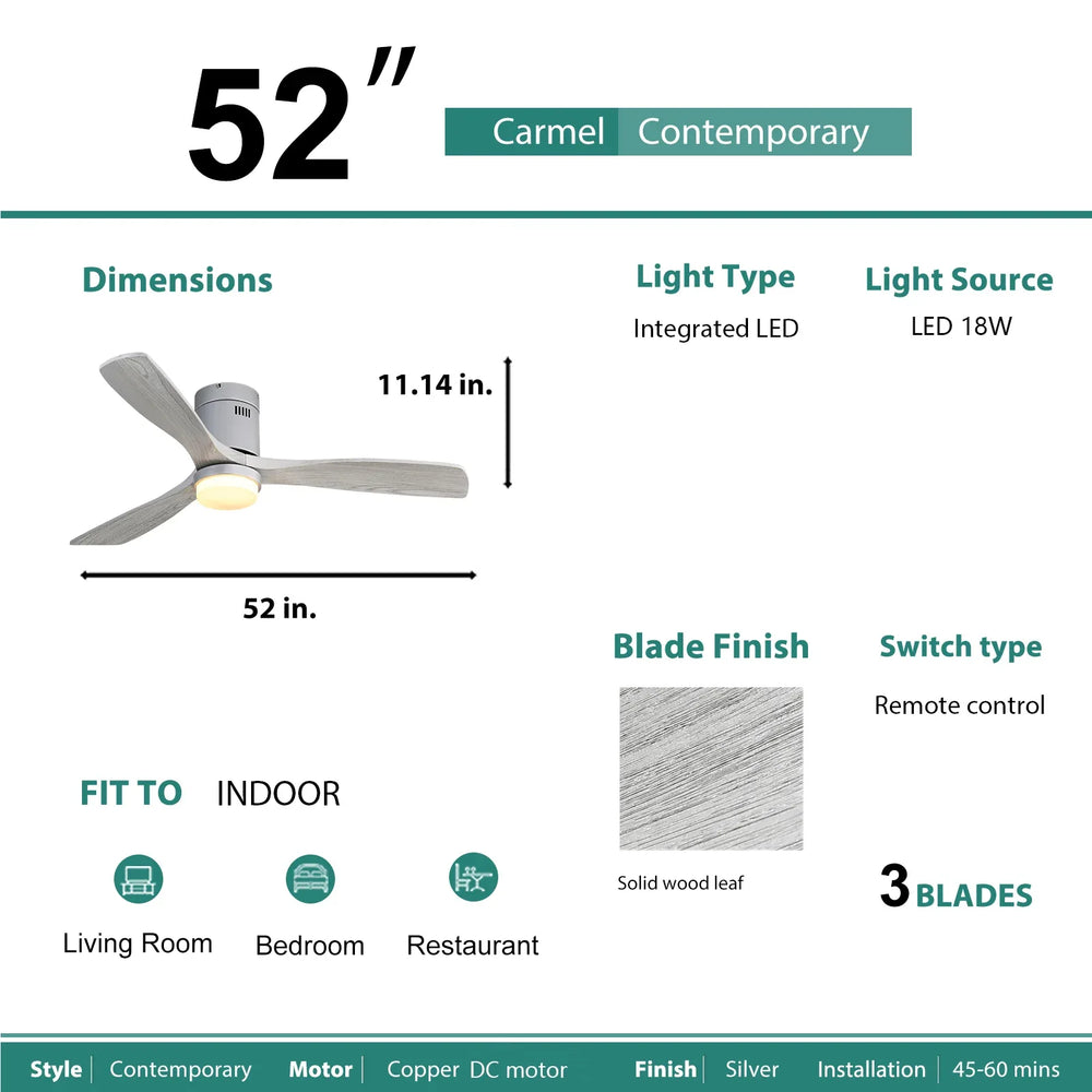 Upgrade your living space with this 52-inch ceiling fan, featuring three solid wood blades that bring timeless style and durability to any room. The ultra-quiet DC motor operates at under 35 decibels, providing powerful airflow without disturbing your peace. Its reversible blade design ensures optimal air circulation throughout the year, keeping you cool in summer and cozy in winter. The integrated 18W LED light offers customizable color temperatures (3000K, 4000K, 6000K) to brighten your room with energy-efficient illumination. With a sleek silver metal finish and gray woodgrain blades, this fan complements both modern and rustic décor. Perfect for bedrooms, living rooms, covered patios, and more, the low-profile flush mount installation adds a refined touch without overwhelming your space. Control fan speed, lighting, and timer settings effortlessly with the included remote for ultimate convenience. Elevate your comfort and style today.