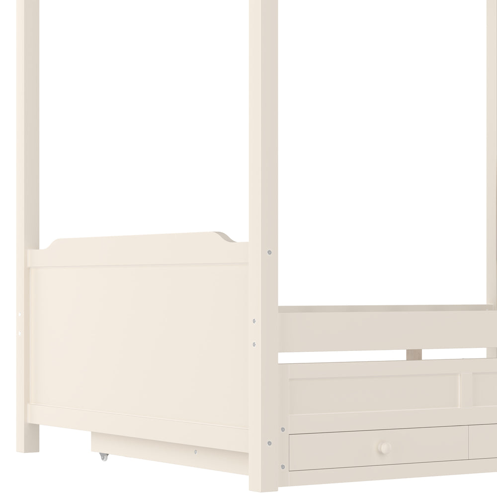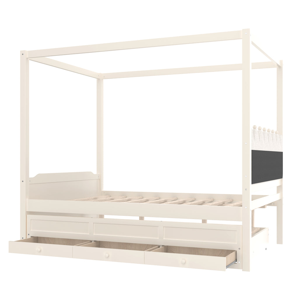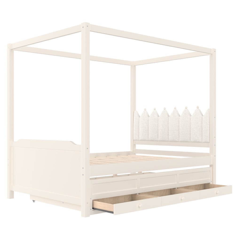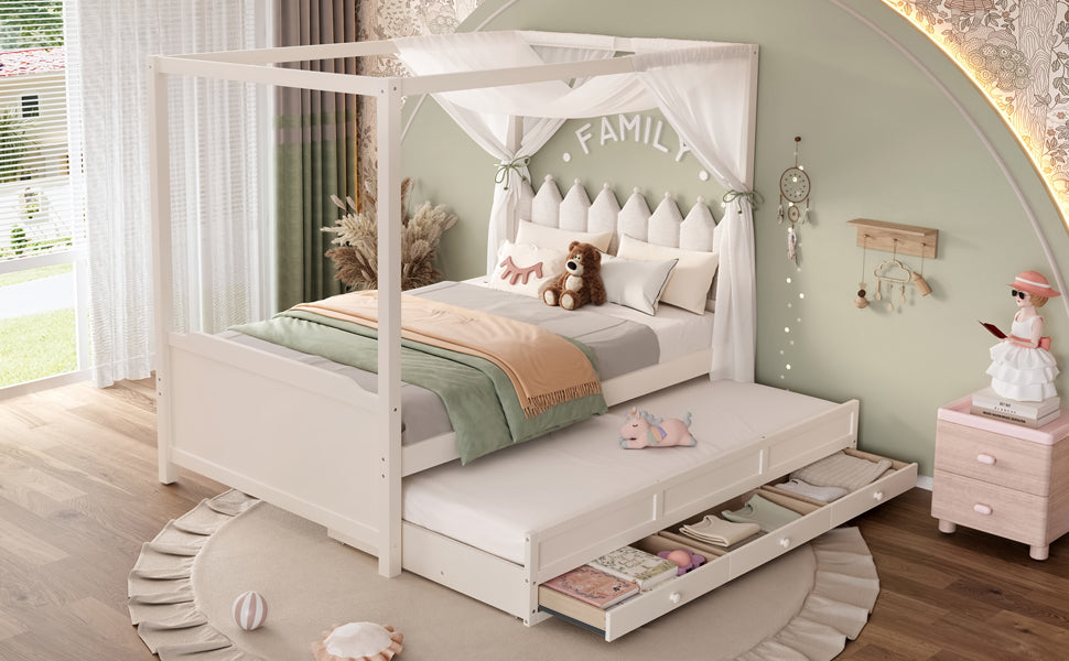 Full-size Princess Canopy Bed features a charming house design with a soft upholstered crown headboard, pull-out twin trundle for extra sleeping space, and three spacious storage drawers. Crafted from sturdy pine and MDF for durability, ideal for kids’ bedrooms.