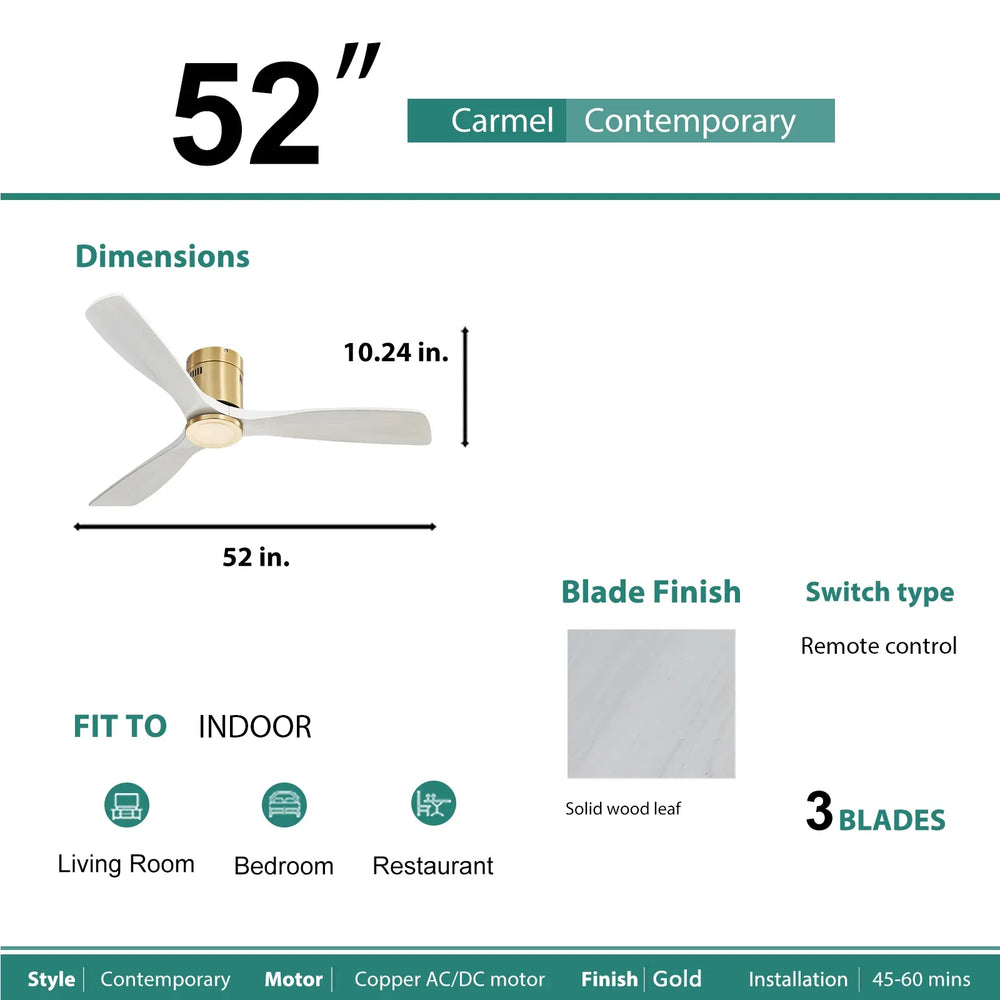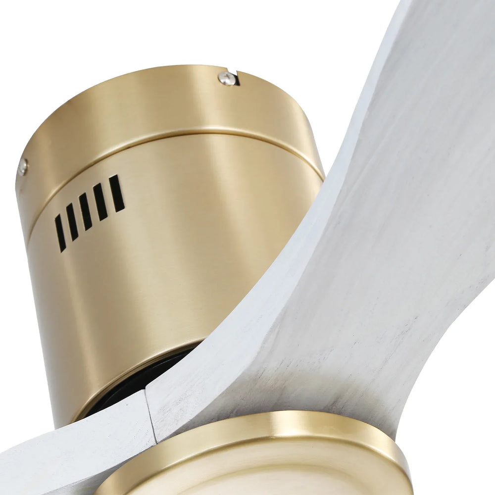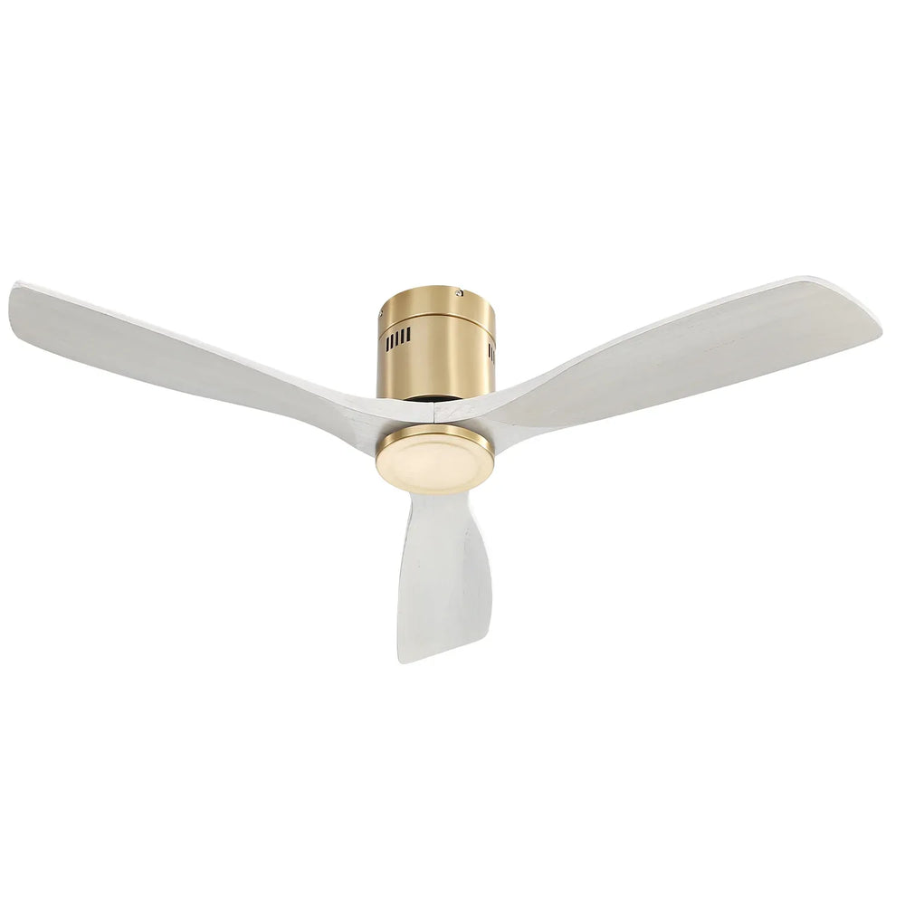 Enhance your living space with this stylish 52-inch ceiling fan featuring three solid wood blades in a natural washed finish. The modern low-profile design blends seamlessly with various decor styles, perfect for patios, bedrooms, living rooms, and cafés. Powered by a silicon steel DC reversible motor, it delivers powerful yet noiseless airflow that keeps your room comfortable year-round. Easily adjust speeds and airflow direction with the included remote control, and enjoy energy-efficient performance that saves on electricity bills. Its flush mount installation and gold metal frame add a vintage, refined touch while maximizing ceiling height. Ideal for both indoor and covered outdoor use, this fan combines functionality and aesthetics to elevate your home’s ambiance. Upgrade your comfort and style today.