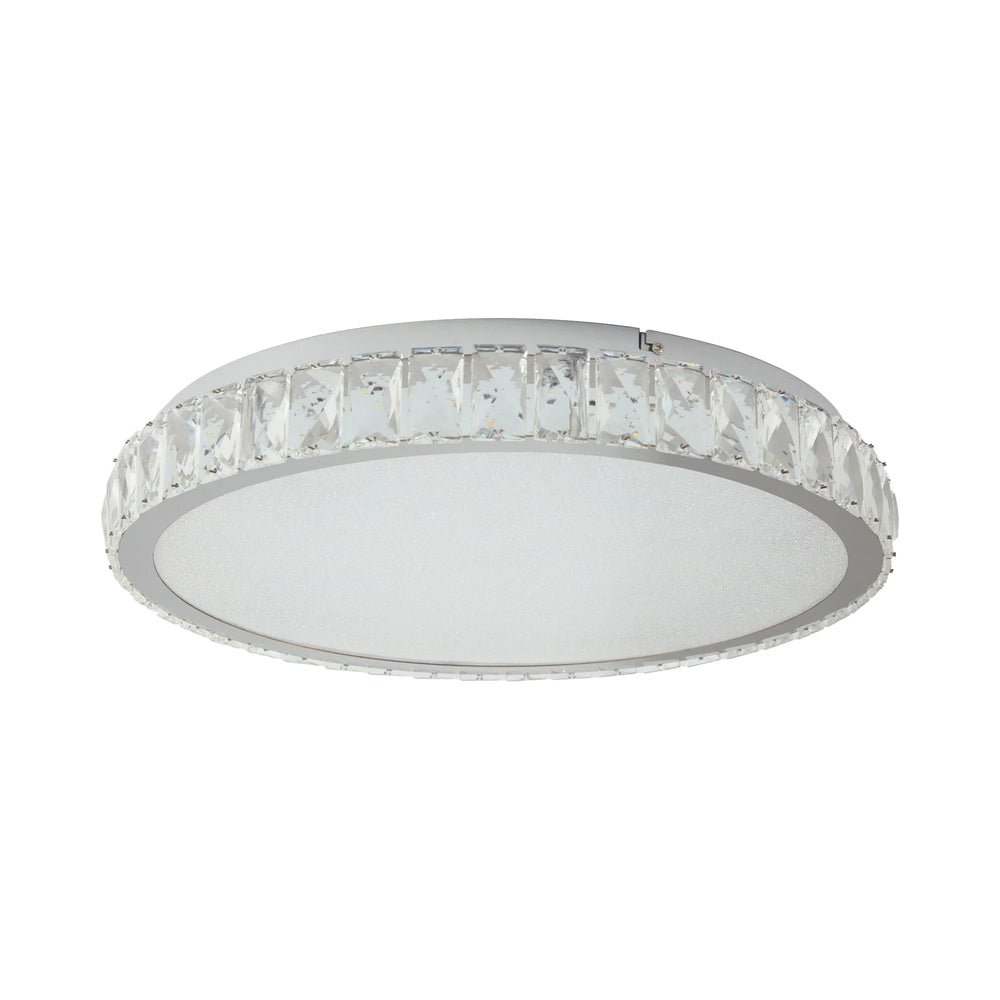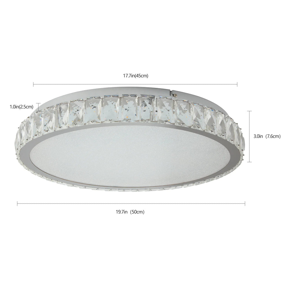 Elevate your living space with this stunning 19.7-inch flush mount LED ceiling light featuring dazzling K9 crystal accents. Designed with a modern chrome iron frame, it delivers brilliant, energy-efficient illumination powered by 45W dimmable LED bulbs. Adjust the brightness effortlessly to create the perfect ambiance—whether bright and lively or soft and cozy. Its sleek, compact profile at just 3 inches (7.6 cm) high fits effortlessly in living rooms, bedrooms, kitchens, and more. Easy to install without special tools, this ceiling fixture combines style and functionality to brighten your home and impress guests. Upgrade your lighting experience with a sophisticated touch and save on energy costs. Illuminate your space beautifully today.