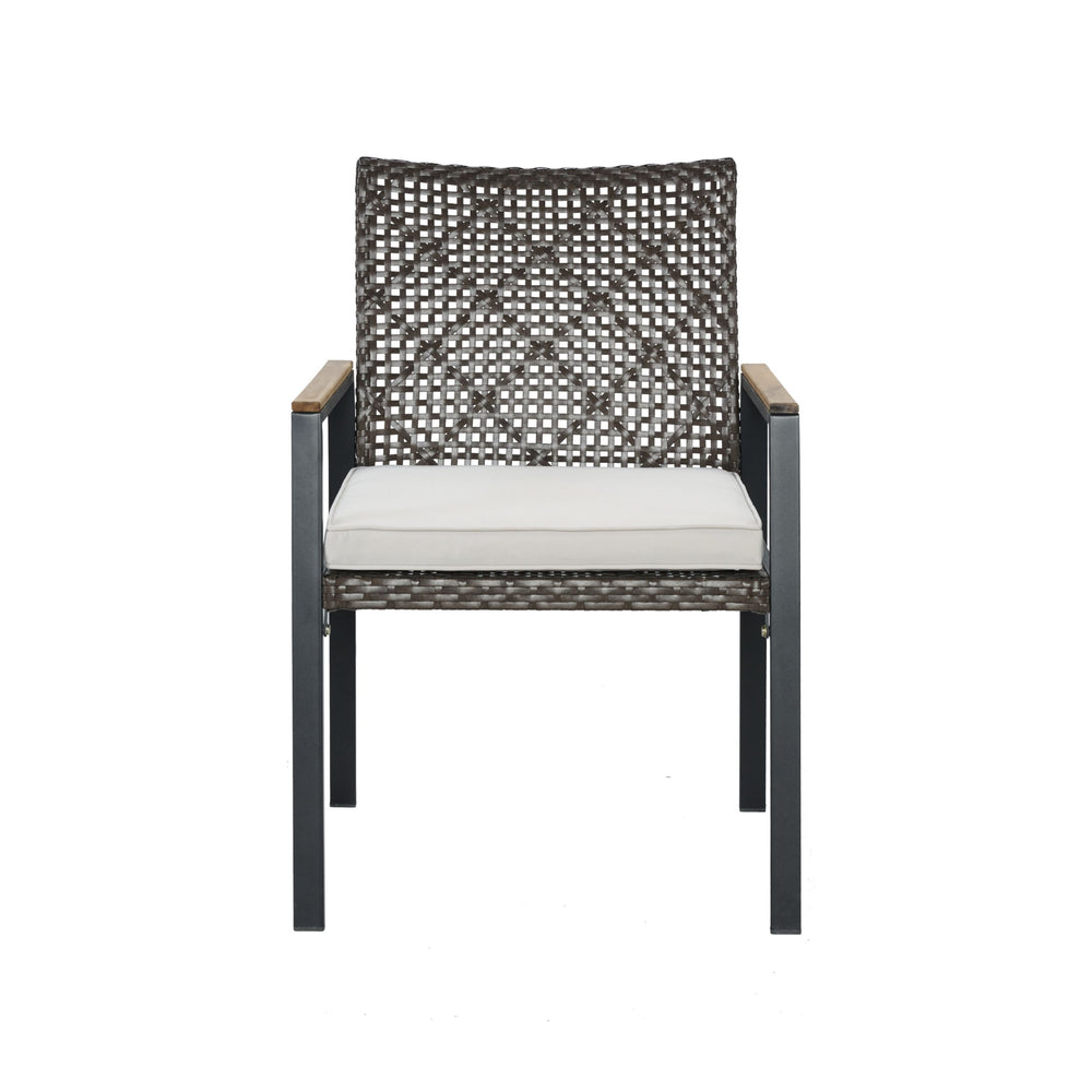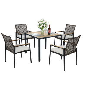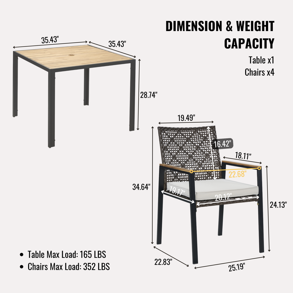 Transform your garden, patio, or backyard into a stylish and comfortable dining retreat with this all-weather 5-piece patio dining set. Featuring a durable acacia wood tabletop with a convenient umbrella hole, it combines natural beauty with exceptional functionality. The dark brown PE rattan chairs are crafted for ergonomic comfort and come with thick, water-resistant cushions that withstand the elements. Built on a sturdy, powder-coated steel frame, this set resists rust and corrosion to stay looking great season after season. Whether hosting an alfresco dinner or enjoying a quiet morning coffee, the blend of solid acacia wood and weatherproof wicker brings timeless American traditional style to your outdoor space. Easy to assemble and designed to seat four, this set invites you to relax and entertain with ease. Elevate your outdoor living today.