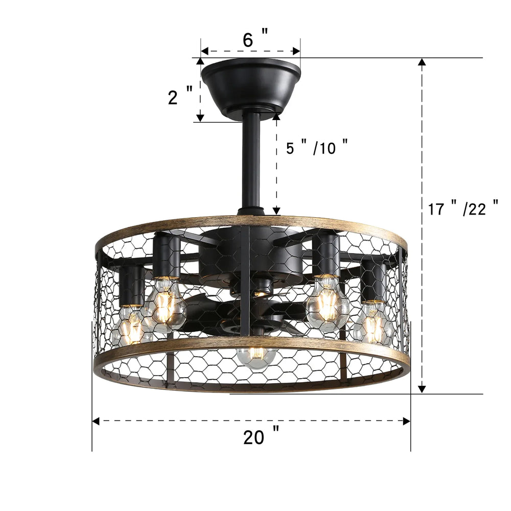 Bring a perfect blend of rustic charm and modern efficiency to your space with this 20-inch industrial caged ceiling fan. Featuring a sturdy ABS and steel construction with 7 ABS blades, it delivers powerful, silent airflow to keep your room fresh all year round. The hand-crafted twisted metal mesh cage and wood-accented details create a striking farmhouse-industrial look that enhances any bedroom, living room, or office. Equipped with a reversible DC motor and 6-speed remote control, this fan easily adapts for cooling in summer and warmth circulation in winter. Its compact 20 x 20 x 17 inch (L x W x H) design is ideal for spaces up to 270 square feet, adding both style and practical ventilation. Elevate your comfort and décor today with this versatile ceiling fan with light.