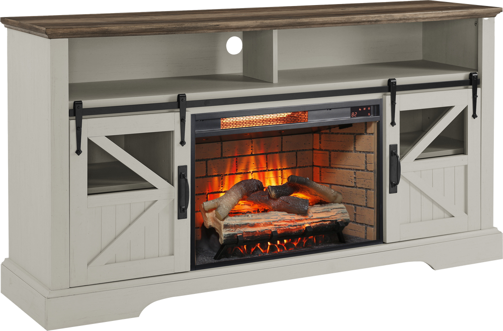 This 60-inch electric fireplace entertainment center features a remote-controlled, multi-color adjustable flame with realistic resin logs, 1500W supplemental heat for up to 400 sq. ft., and a door sensor for enhanced safety, blending farmhouse style with durable wood, stainless steel, and glass construction.