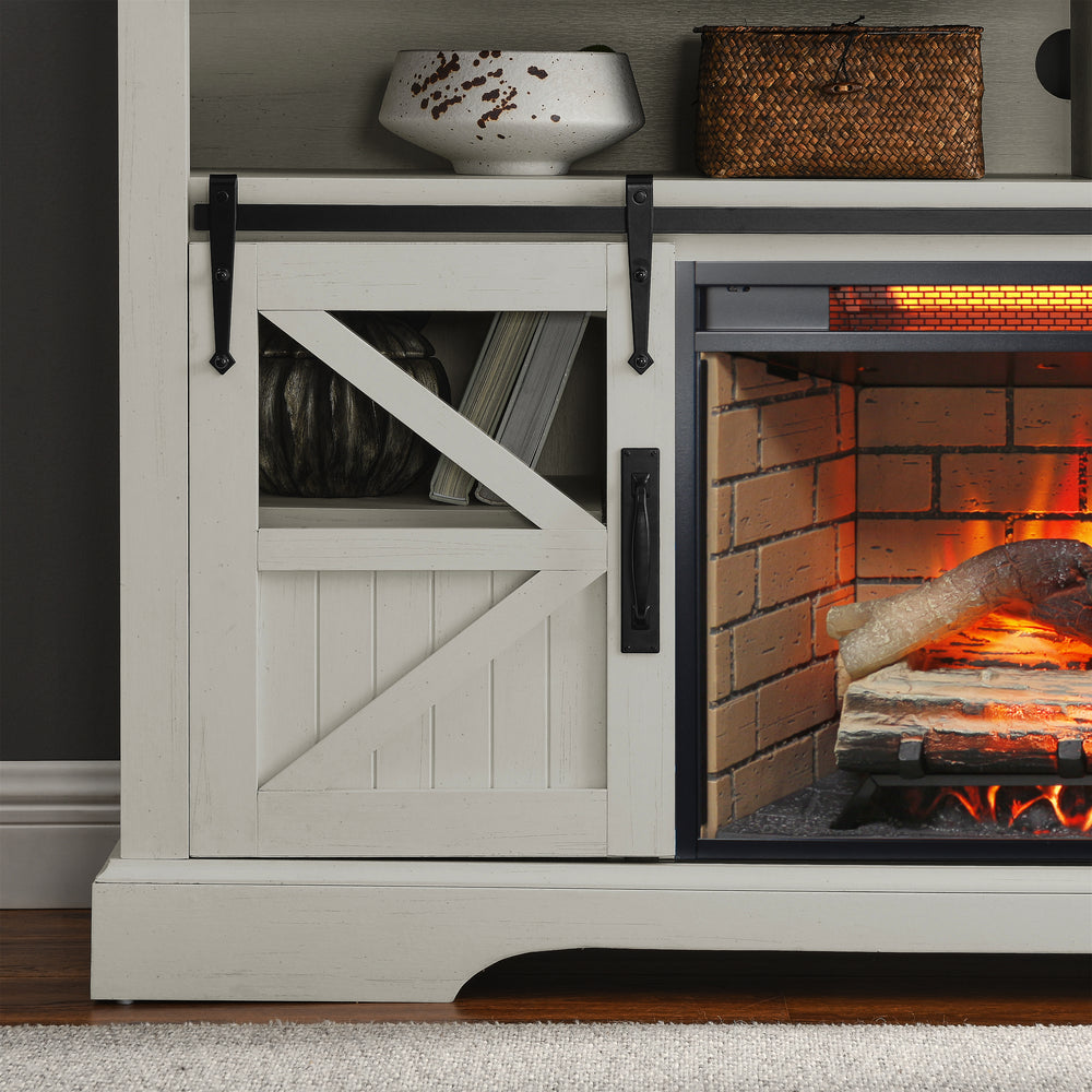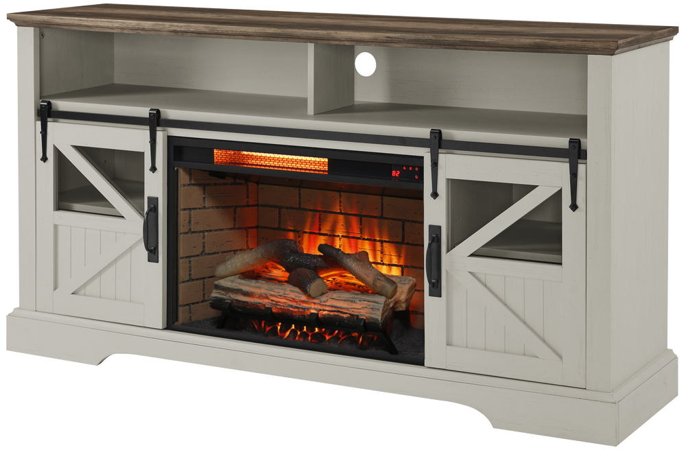 Bring warmth, style, and functionality to your home with this elegant electric fireplace entertainment center in jasmine white. Combining modern and farmhouse design, it effortlessly elevates any living room décor while fitting TVs up to 70 inches. Crafted from durable wood, stainless steel, and glass, this vent-free electric fireplace delivers supplemental heat up to 400 sq. ft. with a powerful 1500W output and realistic resin logs that create a cozy atmosphere year-round. The multi-color adjustable flame effect can be enjoyed with or without heat, offering ambiance for every season. Equipped with a door sensor for enhanced safety, it automatically shuts off when the door is closed. Easy to assemble with clearly labeled parts and featuring multiple storage compartments, this entertainment center blends practicality and luxury. Control the fireplace with the included infrared remote from anywhere in the room. Elevate your relaxation and home entertainment environment today.