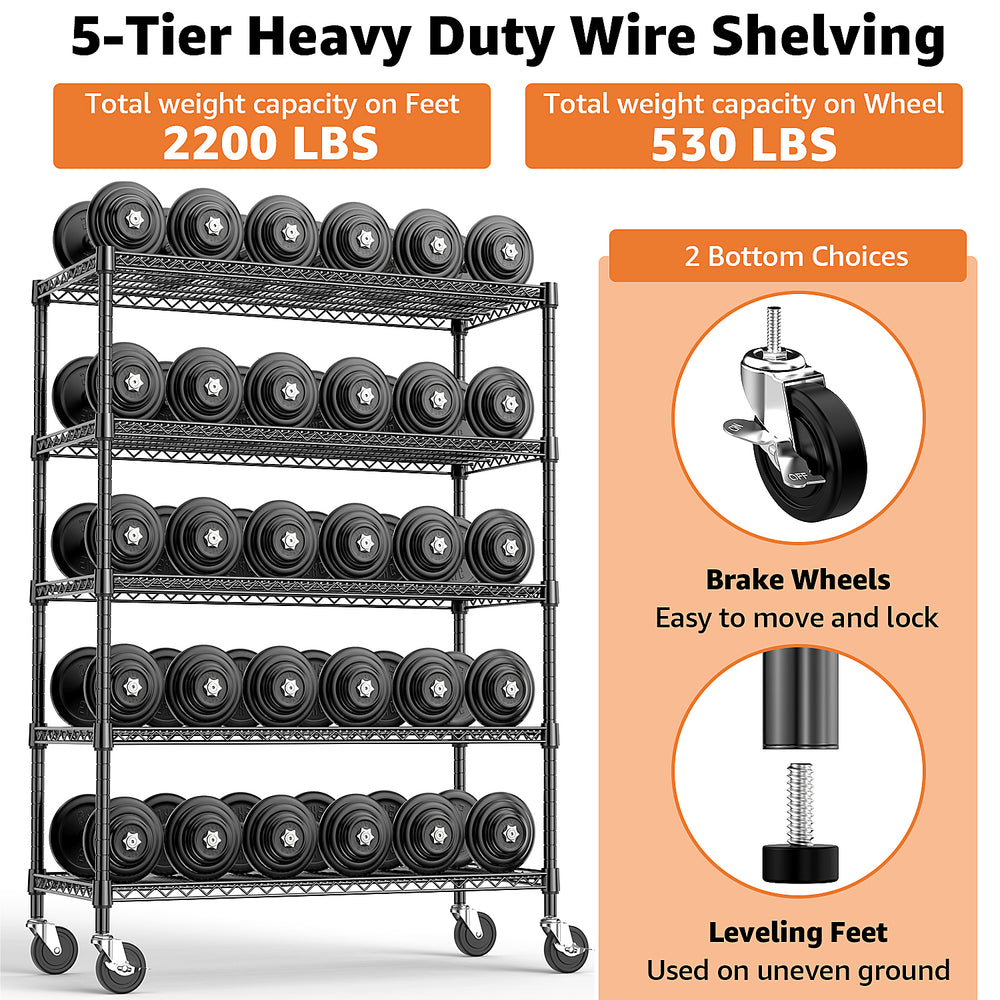 - High Load Capacity: Supports up to 2,200 pounds total (approximately 440 lbs per shelf on leveling feet).