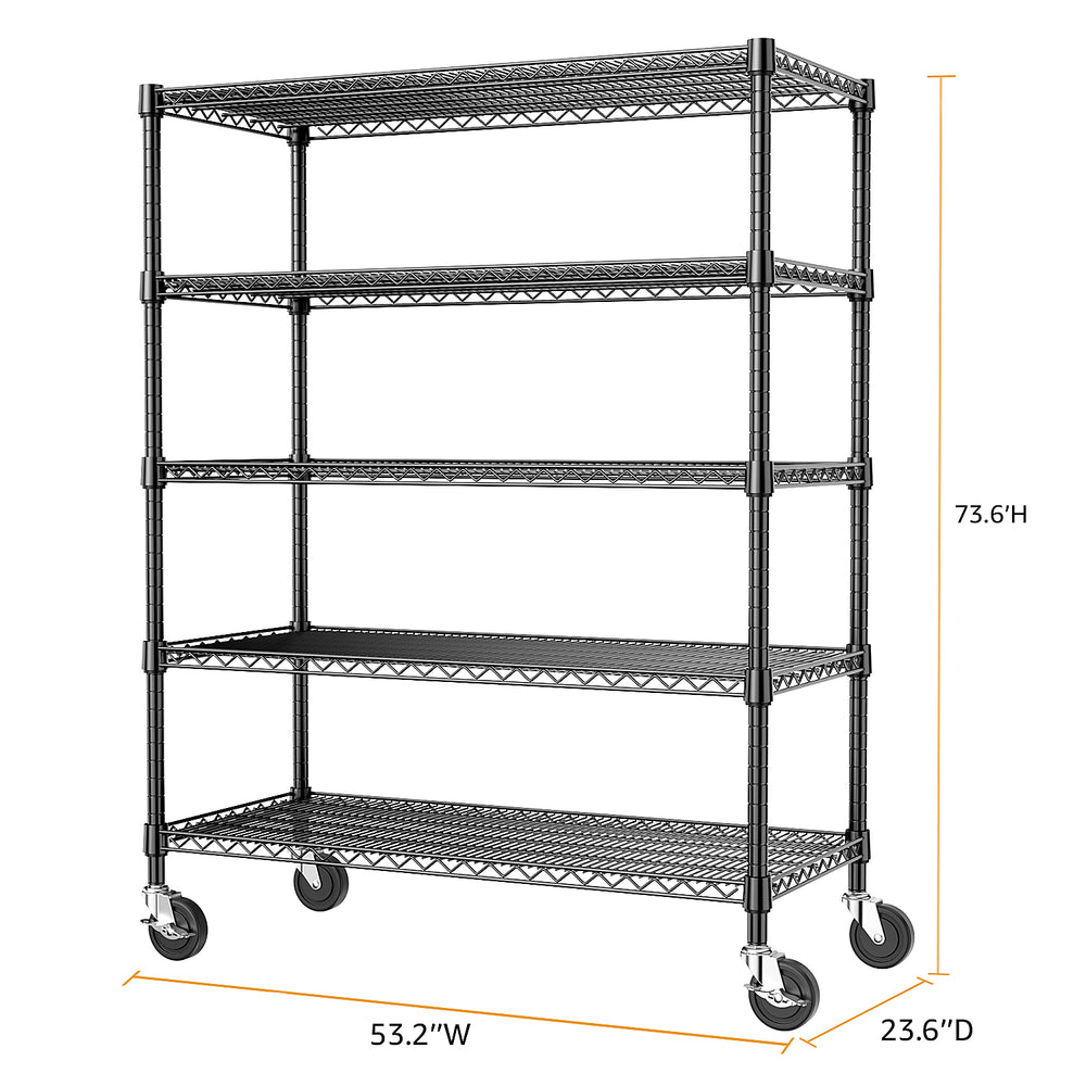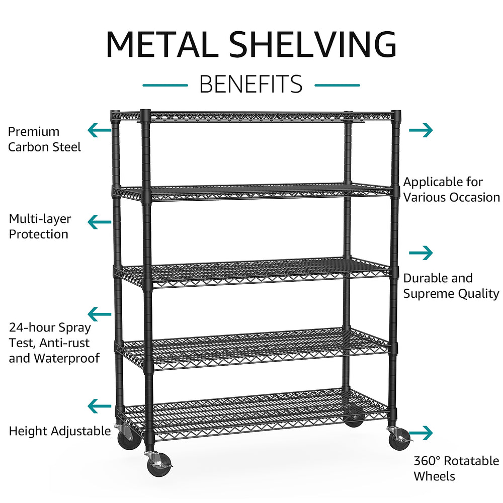 Organize your garage, warehouse, commercial space, or pantry with this robust 5-tier industrial metal shelving unit. Crafted from durable carbon steel, this heavy duty shelving system supports up to 2,200 pounds total load capacity, offering a dependable solution for storing tools, equipment, and supplies. Its adjustable shelves allow for customized height configurations to accommodate items of various sizes. The minimalist black finish provides a sleek, professional look that fits any setting, while four 360° rotatable wheels add effortless mobility for versatile placement. Easy assembly and waterproof coating make it practical and durable for both indoor and semi-outdoor use. Streamline your storage and elevate your space today.