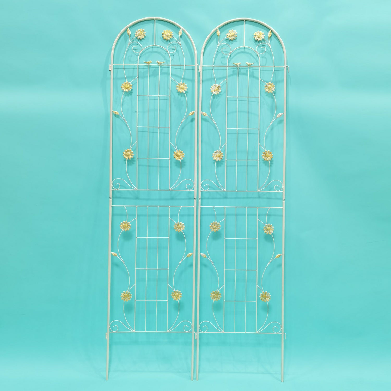 Support your climbing plants with this elegant 2-pack metal garden trellis, perfect for adding height and style to any outdoor space. Standing 86.7 inches (220 cm) tall and 19.7 inches (50 cm) wide each, these cream white iron frames provide sturdy, rust-resistant support for ivy, roses, clematis, and more. The intricate bird, leaf, and flower design not only boosts your garden’s aesthetic but also reinforces stability. Easy to assemble with pre-cut and pre-drilled holes, this trellis set combines functionality with decorative charm. Lightweight yet strong at just 10.1 pounds (4.6 kg) per piece, it’s an ideal choice for gardeners seeking reliable and stylish plant support. Elevate your garden’s beauty and plant health today.