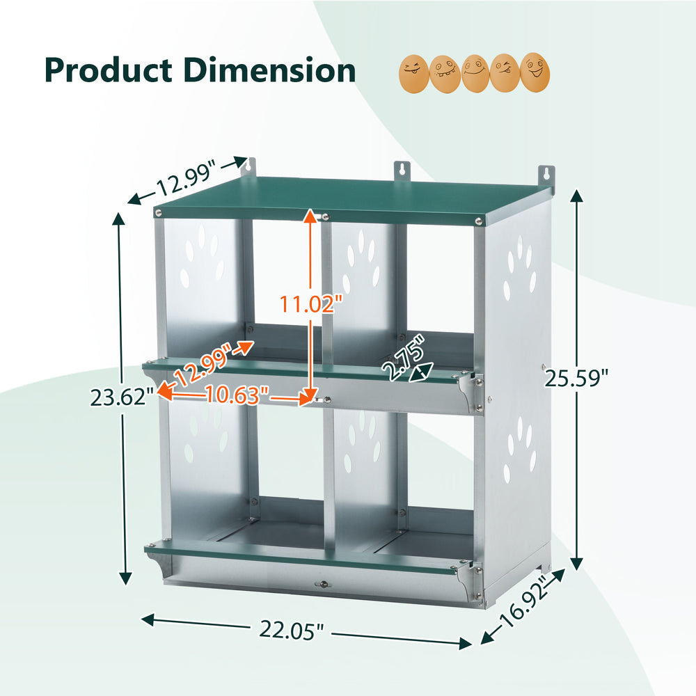 Ensure your hens have a secure, cozy place to lay eggs with this 4 compartment chicken nesting box. Crafted from durable galvanized steel with a rust-resistant green finish, this wall-mount nesting box offers lasting protection and easy maintenance. Each compartment measures approximately 13 x 10.6 x 11 inches, providing ample space for various chicken breeds to nest comfortably and safely. The thoughtfully designed sloping roof prevents water buildup, while side vents promote fresh air circulation to keep the coop dry and cool. A slight floor slope helps eggs roll safely to the front, reducing breakage and simplifying collection. With pre-drilled mounting holes and included assembly instructions, installation is hassle-free. Upgrade your chicken coop with this functional, easy-to-clean nesting box and support healthy, consistent egg production. Elevate your poultry care today.