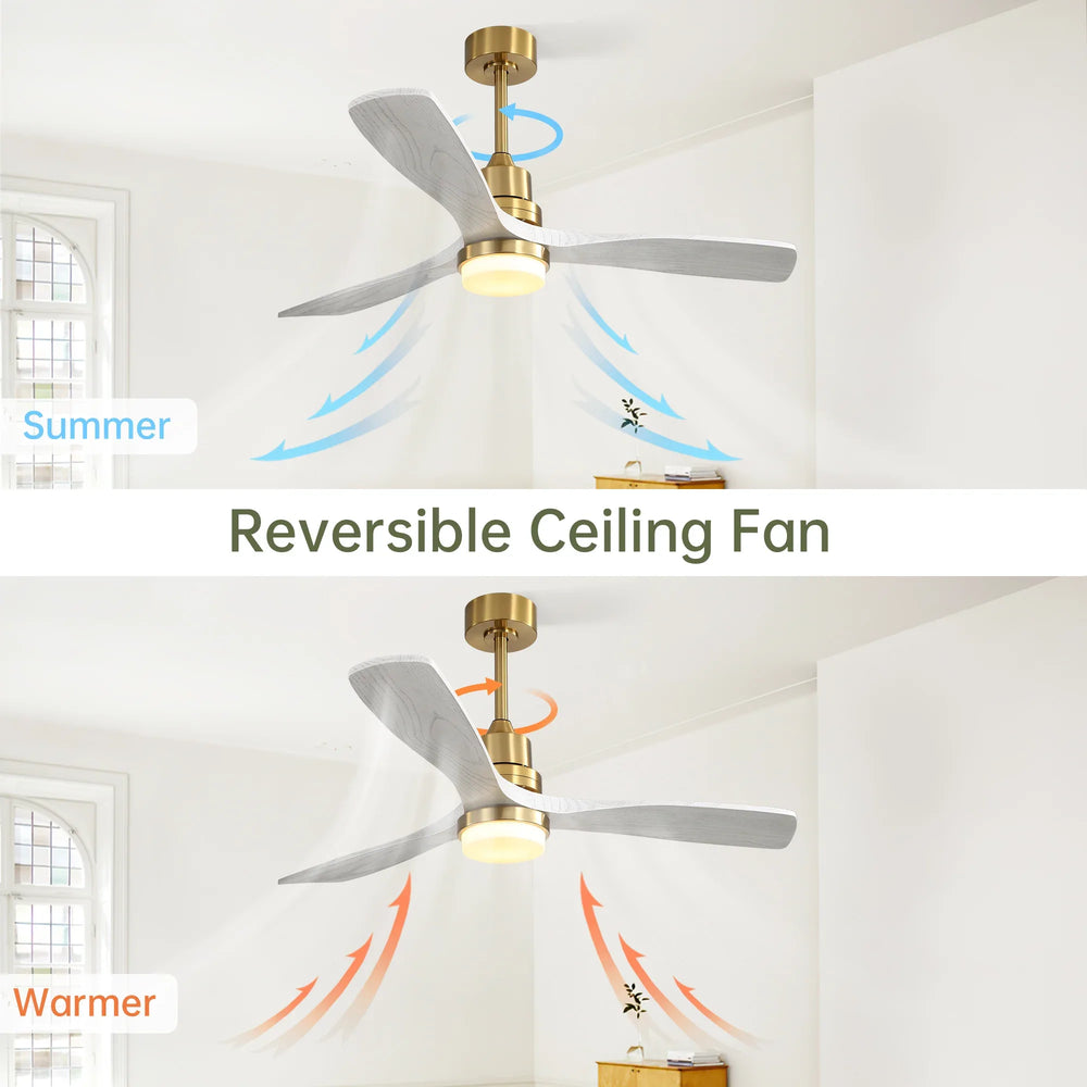 52-inch ceiling fan features a quiet, energy-efficient DC motor with reversible blades and 6-speed remote control for year-round comfort. Equipped with dimmable 3-color LED lighting and durable wood blades, it enhances airflow and ambiance in medium to large indoor spaces.