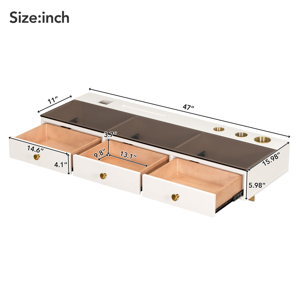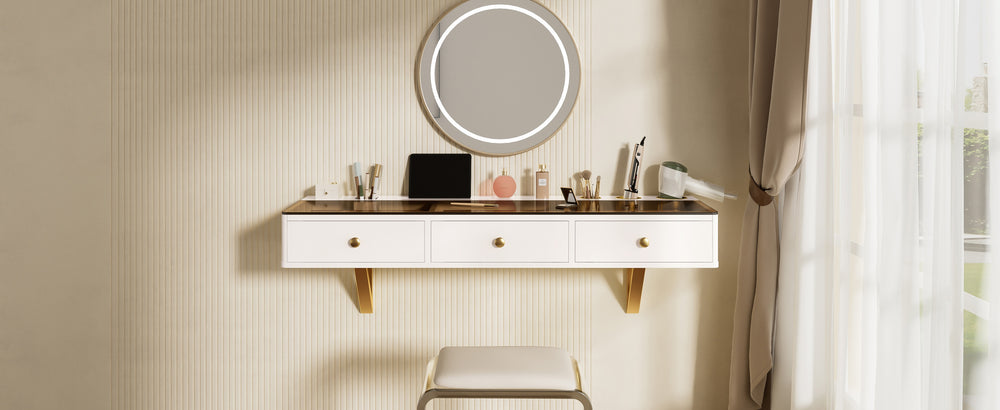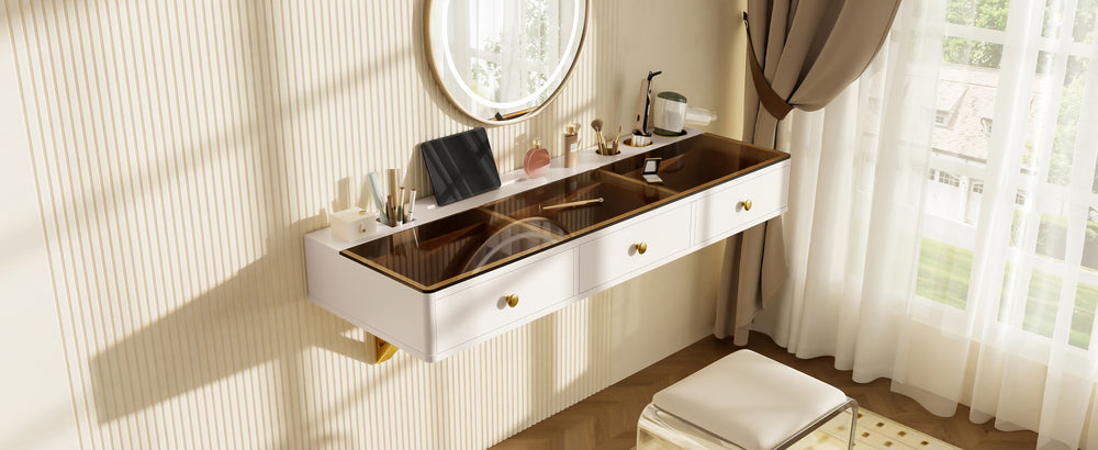 Elevate your bedroom, bathroom, or workspace with this multifunctional wall-mounted vanity table. Crafted from durable MDF and glass in a sophisticated light beige finish, it offers a sleek floating design that saves floor space while adding modern style. Featuring three spacious drawers and dedicated compartments, it keeps your makeup, hair tools, or office essentials neatly organized and within easy reach. The integrated tablet and phone holder enhances convenience, making it perfect as a makeup station, hairdresser’s desk, or compact workstation. Supported by sturdy triangular brackets, this vanity holds up to 100 pounds while maintaining high stability. Easy to assemble and install, it’s the ideal solution for small rooms or anyone seeking a stylish, practical mounted shelf. Transform your daily routine and elevate your organization today.