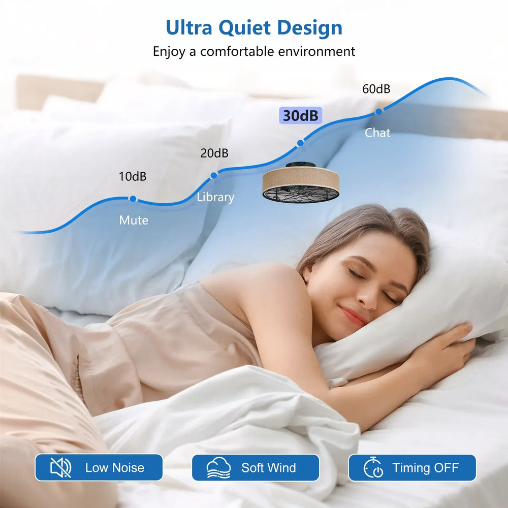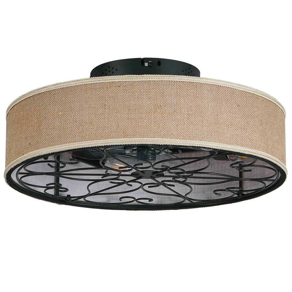 Experience seamless cooling and stylish illumination with this 20-inch caged ceiling fan, designed to fit flush with your ceiling for a low-profile farmhouse look. Its modern black iron frame and fabric linen shade blend rustic charm with contemporary elegance, perfect for bedrooms, living rooms, or home offices. Enjoy six adjustable fan speeds and a reversible motor for year-round comfort, all controlled effortlessly via remote with silent, mute operation. The bladeless design ensures a gentle, consistent breeze without noisy blades, while the four compatible E26 bulbs (not included) provide ample, warm LED lighting to brighten your space beautifully. Its compact dimensions—just 7.1 inches high and weighing only 10.7 lbs—make it ideal for rooms with lower ceilings. Upgrade your living space with this multifunctional fan light that combines efficiency with farmhouse style. Elevate your home’s atmosphere today.