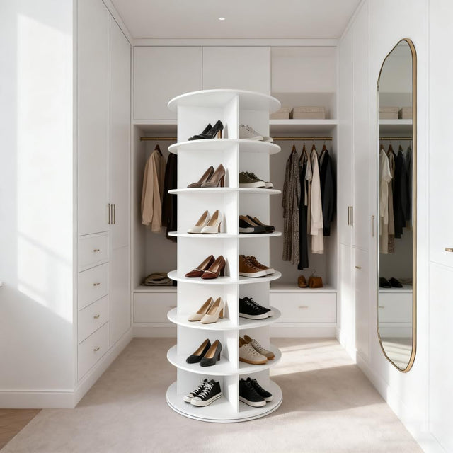 Omega Lifestyles 7-tier rotating shoe rack offers 360° smooth rotation for easy access and stylish storage. Made of durable PVC, it fits up to 28 pairs of shoes from flats to boots, with open compartments to keep shoes fresh and organized.