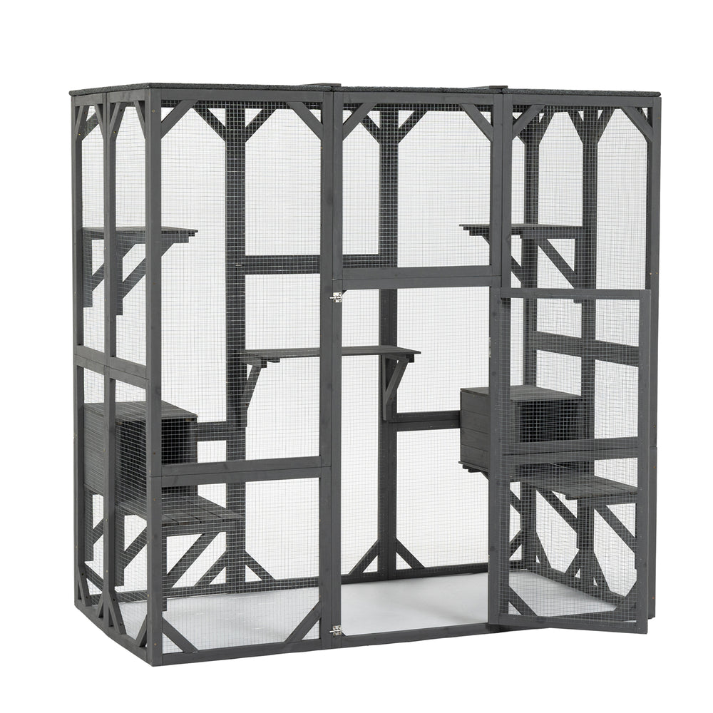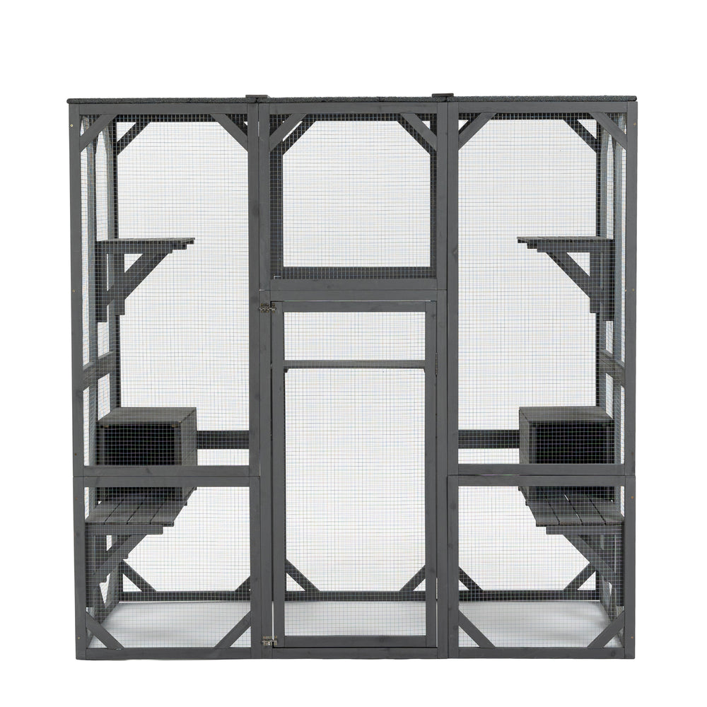 Give your feline friend a safe, fun, and weatherproof outdoor space with this large wooden catio enclosure. Crafted from durable fir wood and reinforced with galvanized mesh, it offers a secure environment where cats can explore, climb, and rest comfortably. Featuring five jumping platforms and two cozy condos, this cat cage supports natural play and restful hideaways. The lightweight, waterproof PP sheet roof protects against rain and snow, while an attached rainproof cover ensures your cat stays cozy in all weather. A large lockable door makes feeding and cleaning effortless, combining convenience with security. Measuring 71 inches long by 37 inches wide and 71 inches high, this grey cat house perfectly blends durability and comfort to enrich your pet’s outdoor experience. Elevate your cat’s playtime and relaxation today.