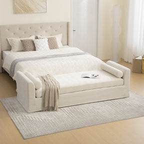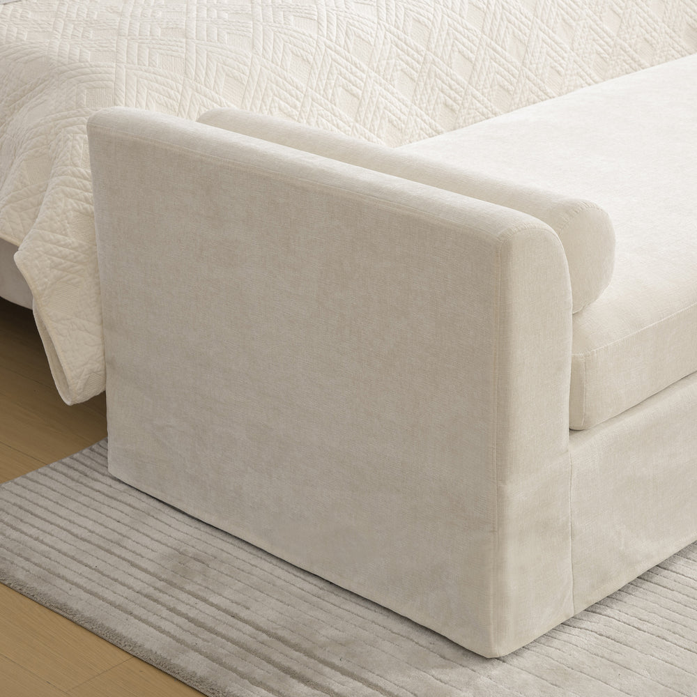This beige chenille chaise lounge features a sturdy wooden frame and soft spring-and-sponge seat cushions with removable pillows, offering comfortable seating for two. Its minimalist design fits bedrooms, living rooms, or entryways, supporting up to 450 pounds with easy partial assembly.