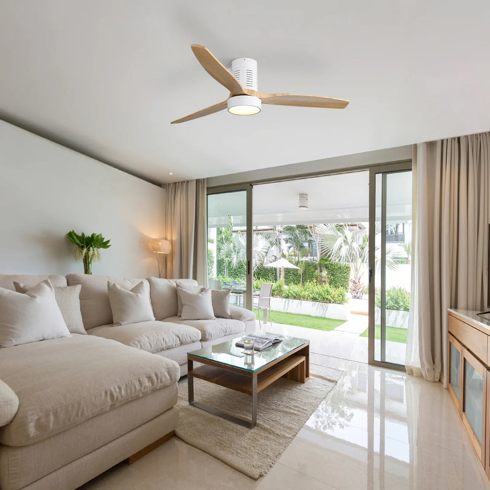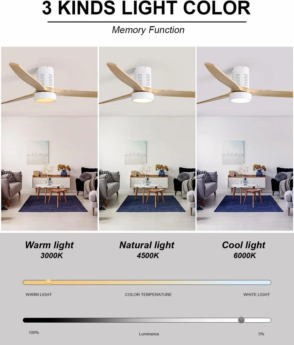 Upgrade your living space with this modern indoor ceiling fan featuring solid natural wood blades and a sleek flush mount design that complements any décor. Its whisper-quiet DC motor ensures powerful and efficient airflow to keep your room comfortable through all seasons. Easily control fan speed and lighting with the included remote, offering convenience at your fingertips. The integrated 18W LED light provides adjustable color temperatures (3000K, 4500K, 6000K) and a lighting memory function for personalized ambiance. Ideal for bedrooms, living rooms, offices, and even covered outdoor areas, this fan combines style, functionality, and energy efficiency in one elegant package. Elevate your home’s comfort and ambiance today.