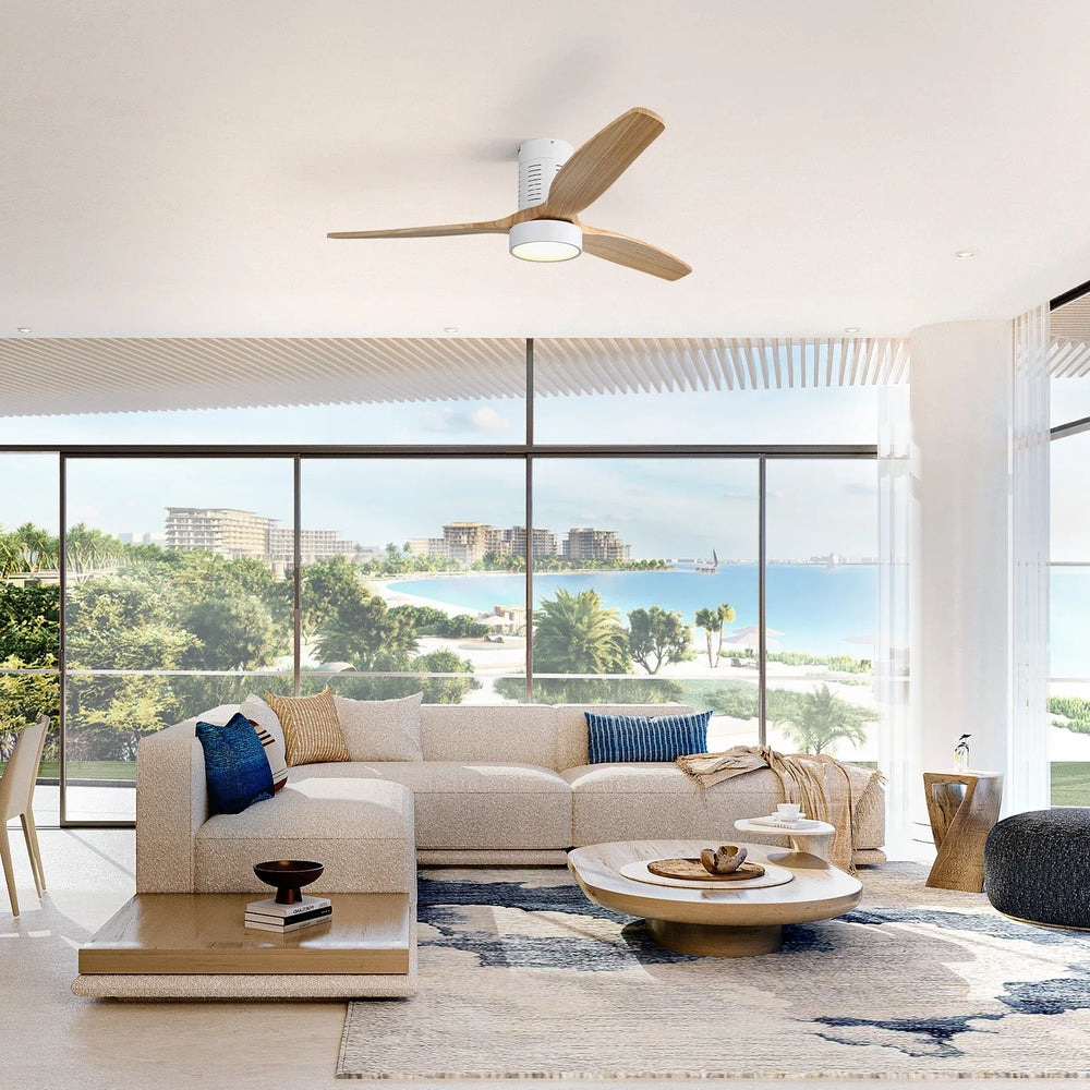 Modern wooden ceiling fan features solid wood blades and a flush mount design for stylish, space-saving installation. Whisper-quiet reversible airflow with remote control offers year-round comfort and energy-efficient 3CCT LED lighting, ideal for bedrooms, living rooms, patios, and offices.