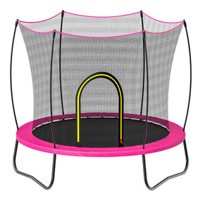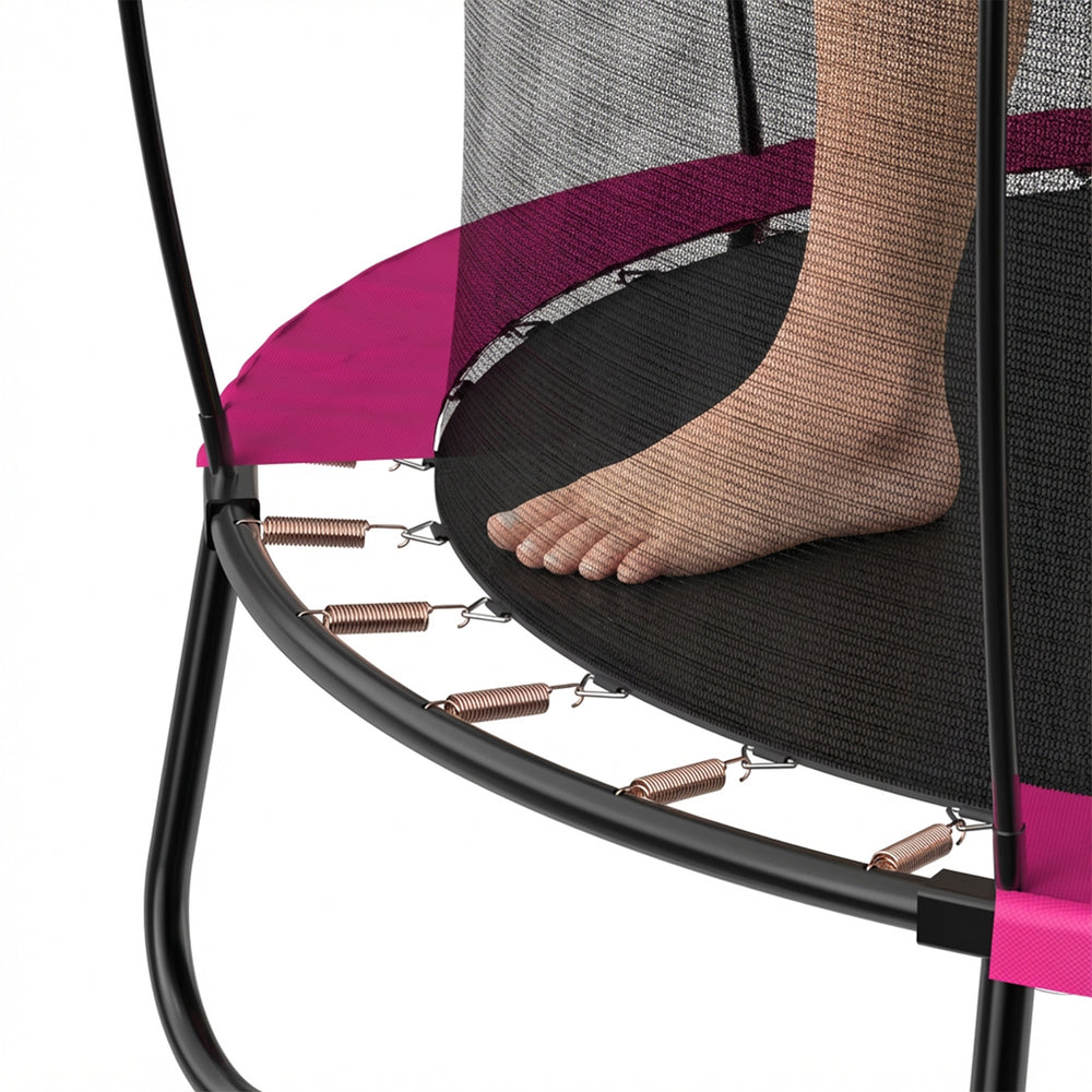 Bring excitement and active playtime to your backyard with this 55-inch trampoline designed for lasting safety and durability. Featuring a galvanized steel frame with black powder coating, it resists corrosion and stands up to the elements, ensuring long-term use. The no-gap, no-foot-entrapment design provides extra peace of mind for parents while kids jump freely. Equipped with three sturdy U-legs and six reinforced safety net poles, this trampoline offers superior stability. The high-density, UV-resistant enclosure net is securely stitched to the jumping mat, creating a safe, gap-free jumping space. Plus, the waterproof and UV-resistant frame cover protects against weather damage, maintaining the trampoline’s strength and appearance season after season. Perfect for energetic kids, this trampoline meets essential safety standards so you can purchase with confidence. Elevate your outdoor fun today with this stylish and secure trampoline in vibrant dark pink.