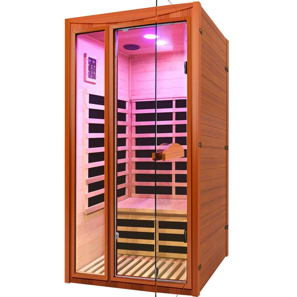 Omega Lifestyles far infrared dry sauna features durable Okoumé wood construction with hypoallergenic, scar-resistant properties, colorful and warm lighting, and Bluetooth speakers for relaxation, improved circulation, pain relief, and stress reduction in a compact home spa setting.