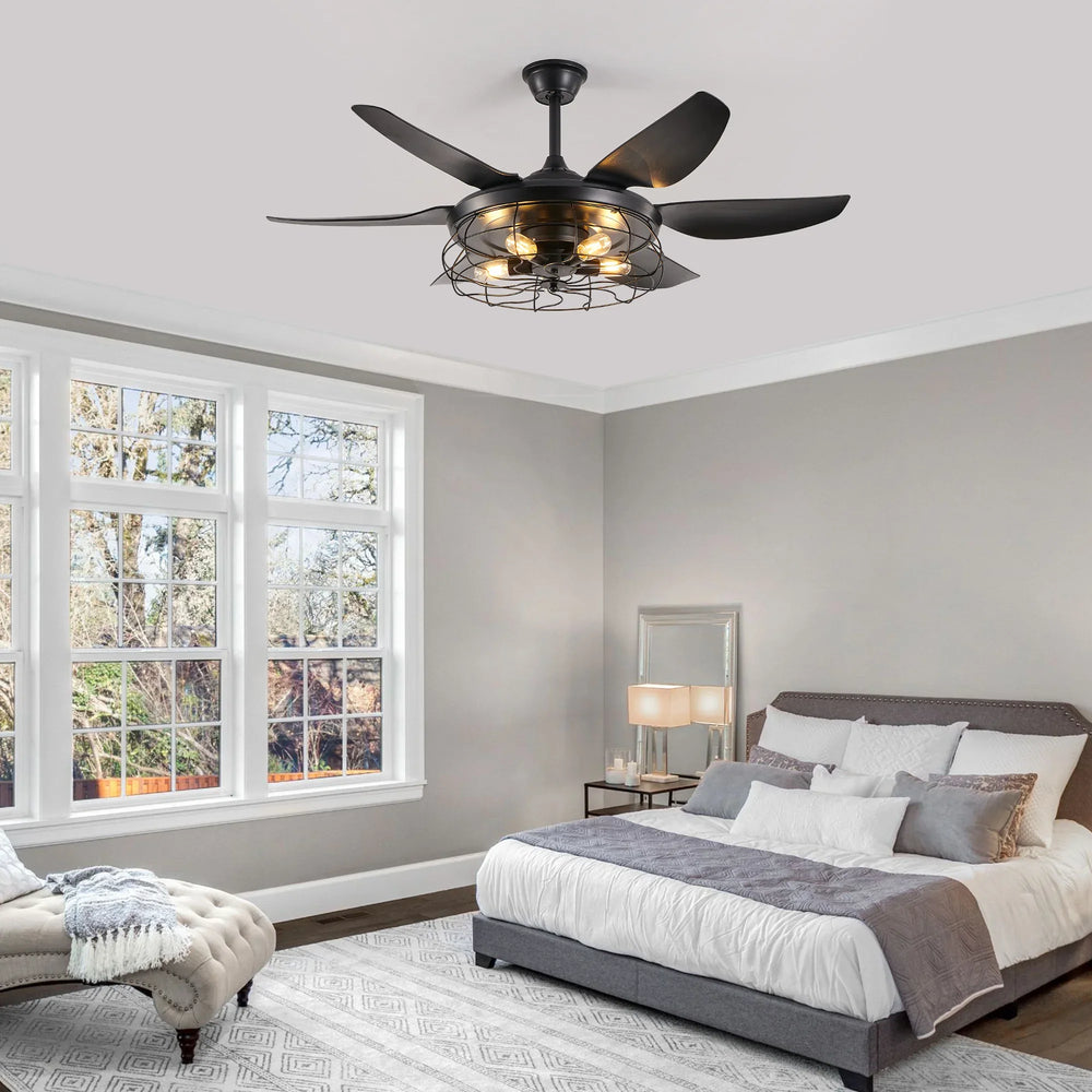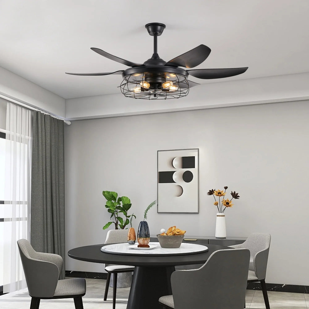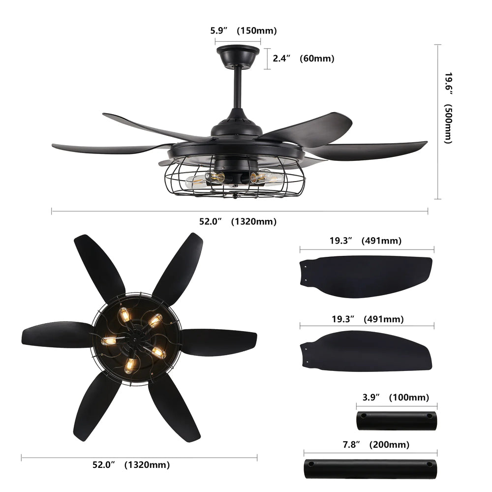 Bring together style and functionality with this modern 52-inch black ceiling fan featuring an industrial cage design and six aerodynamic blades. Crafted from durable ABS and iron, it delivers efficient, whisper-quiet air circulation ideal for living rooms, bedrooms, and dining areas. The integrated lighting system brightens your space with up to five E26 bulbs (not included), combining practicality with sleek aesthetics. Easily control fan speed and lighting from anywhere in the room using the included remote control, and enjoy energy-efficient performance thanks to its reversible DC motor. This ceiling fan’s minimalist industrial look complements a variety of décor styles while optimizing comfort and ambiance. Upgrade your home’s airflow and lighting effortlessly—elevate your relaxation today.